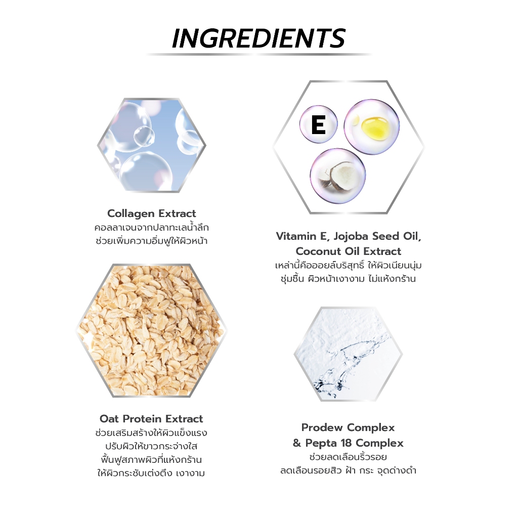 ... าหลากชนิด เช่น Collagen Extract สารสกัดคอลลาเจนจากปลาทะเลน้ำลึก ช่วยเพิ่มความอิ่มฟูให้ผิวหน้า และ Vitamin E, Jojoba Seed Oil, Coconut Oil Extract เหล่านี้คือออยล์บริสุทธิ์ ที่มีคุณสมบัติช่วยให้ผิวเนียนนุ่ม ชุ่มชื้น ผิวหน้าเงางาม ไม่แห้งกร้าน รวมถึง PRODEW COMPLEX คือกรดอะมิโนที่มีประโยชน์รวม 12 ชนิด และ PEPTA 18 COMPLEX เปปไทด์คุณภาพรวม 18 ชนิด ช่วยลดเลือนริ้วรอย ลดเลือนรอยสิว ฝ้า กระ จุดด่างดำต่างๆ อีกทั้งยังมี Oat Protein Extract สารสกัดโปรตีนจากข้าวโอ๊ต ที่ช่วยเสริมสร้างให้ผิวแข็งแรง ไม่แพ้ง่าย และค่อยๆ ปรับผิวให้แลดูกระจ่างใส ฟื้นฟูสภาพผิวที่แห้งกร้าน ช่วยให้ผิวกระชับเต่งตึง เงางาม แลดูอ่อนกว่าวัยในทุกๆ วัน วิธีใช้ หลังจากล้างทำความสะอาดผิวหน้าและซับให้แห้ง เปิดฝาหลอด บีบเนื้อครีมมาสก์ออกมาในปริมาณที่พอเหมาะกับขนาดของผิวหน้า ทาและเกลี่ยให้ทั่วบริเวณโดยไม่ให้บางหรือหนาจนเกินไป เว้นรอบดวงตาและริมฝีปาก หลังจากนั้นปล่อยทิ้งไว้ประมาณ 20 - 30 นาทีจนเนื้อมาสก์แห้งและเริ่มร่อนออกจากผิวหน้า หลังจากนั้นค่อยๆ ลอกแผ่นมาสก์ออกจากผิวหน้าโดยไม่ต้องล้างออก เนื้อครีมจะซึมลงสู่ผิวเผยให้เห็นผิวหน้าที่ผ่องใสเงางามในทันทีหลังใช้งาน สามารถใช้ได้ 3-4 ครั้งต่อสัปดาห์หรือทุกวันตามต้องการ คำแนะนำ : 1. ปิดฝาให้สนิททุกครั้งหลังการใช้งาน 2. ควรเก็บรักษาในที่แห้งและเย็น หลีกเลี่ยงจากแสงแดด (อุณหภูมิที่แนะนำ 18~25 องศา)