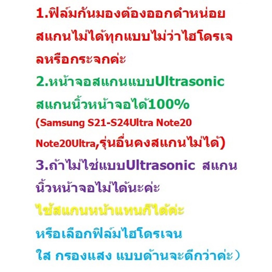 ... รึ่ง แนะนำเปิดลิงค์สั่งของดูวิดีโอก่อนติด) ชั้นที่4 แผ่นสีขาว ฟิล์มกันมองต้องออกดำหน่อย สแกนไม่ได้ทุกแบบไม่ว่าไฮโดรเจลหรือกระจก หน้าจอสแกนแบบUltrasonic สแกนนิ้วหน้าจอได้100% (Samsung S21-S24Ultra Note20 Note20Ultra,รุ่นอื่นคงสแกนไม่ได้) ถ้าไม่ไช่แบบ Ultrasonic สแกนนิ้วหน้าจอไม่ได้นะค่ะ ไช้สแกนหน้าแทนหรือเลือกฟิล์มไฮโดรเจน ใส ด้าน กรองสแสงจะดีกว่าค่ะ) วิธีการติด: 1.ทำความสะอาจหน้าจอ 2.ดึงจากชั้นที่4(สีขาว) 3.แปะหน้าจอ 4.รีดชั้น3ทั้ง2ชิ้นออก 5.ดึงชั้น1(มีLogo)ออก เต็มจออาจจะดัน ต้องไปลองเอง(เคสทุกแบบไม่เหมือนกัน) แต่ไม่เต็มจอไม่ดันแน่นอน เต็มจอถึงขอบ ไม่เต็มจอเล็กกว่า1.5MM(ตัวอย๋าง=เต็มจอ:155mm*70mm/ไม่เต็มจอ:153.5*68.5) คุณสมบัติ ในแพ็คเกจมีตัวฟิล์มกับเครื่องมือทำความสะอาจให้นะค่ะ ขอบไม่ลอยแน่นอน สำหรับเครื่องจอโค้งดีที่สุด ไม่ไช่จอโค้งก็ติดได้ค่ะ ️เนื้อฟิล์มด้าน มีความยืดหยุ่นสูง ติดง่าย ไม่ทิ้งคราบกาว ️ป้องกันรอยขีดข่วน ฝุ่นละออง รอยนิ้วมือ คราบน้ำ ️ฟิล์มคลุมถึงขอบกระจก ฟิล์มโค้งลงไปตามขอบกระจก ️จับกระชับมือ ไม่ลื่น ️เมื่อติดแล้วดูหรูหรา สวยงาม และสามารถใส่เคสได้ปกติ เนื้อฟิล์ม 0.15MM