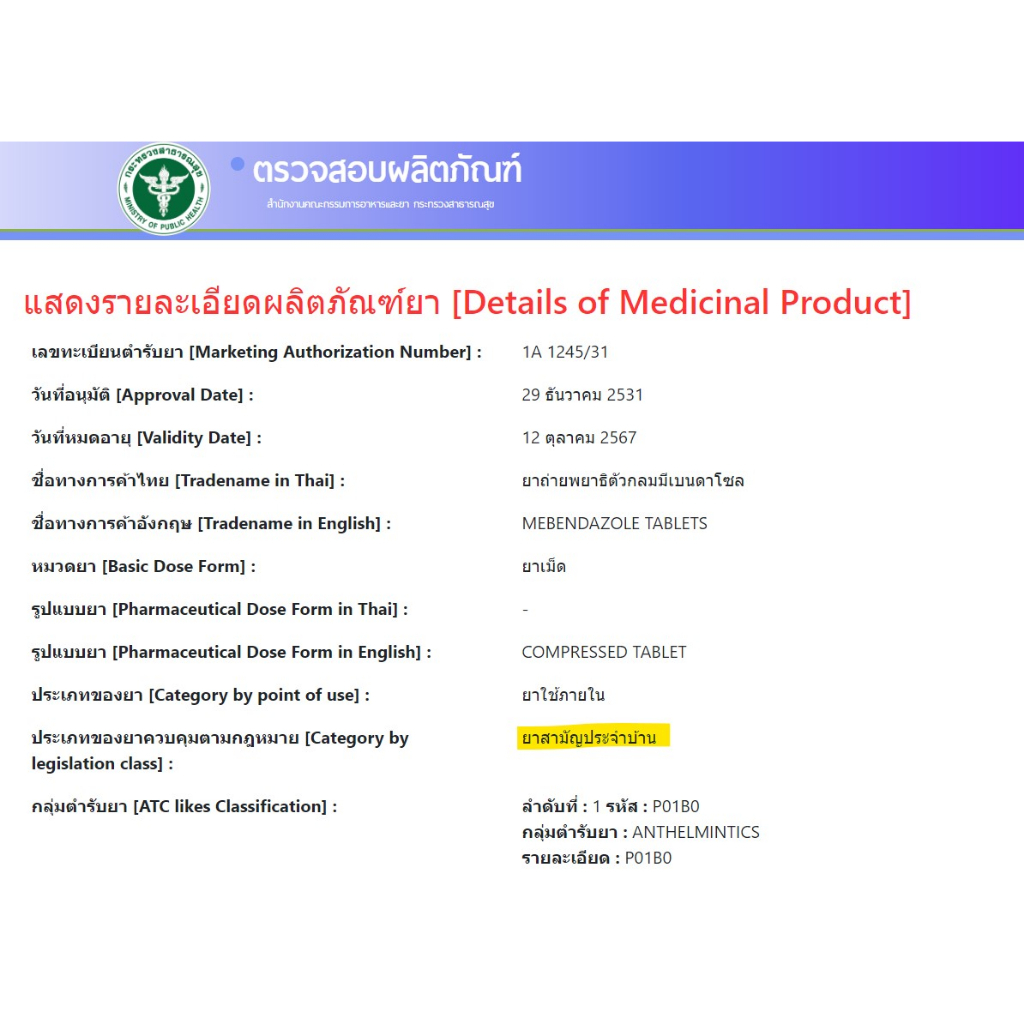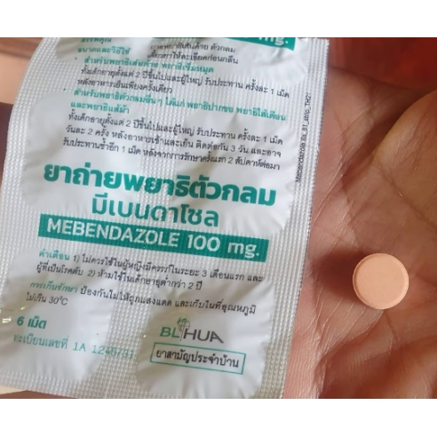ยาถ่ายพยาธิตัวกลม Mebendazole 100mg/เม็ด (แผงละ 6 เม็ด) ขนาดและวิธีการใช้ เคี้ยวให้ละเอียดก่อนกลืน ทั้งเด็กอายุตั้งแต่ 2 ปีขึ้นไปและผู้ใหญ่รับประทานครั้งละ 1 เม็ด หลังอาหารเย็น เพียงครั้งเดียว สำหรับพยาธิตัวกลมอื่นๆ ได้แก่ พยาธิปากขอ พยาธิไส้เดือน และพยาธิแส้ม้า ทั้งเด็กอายุตั้งแต่ 2 ปีขึ