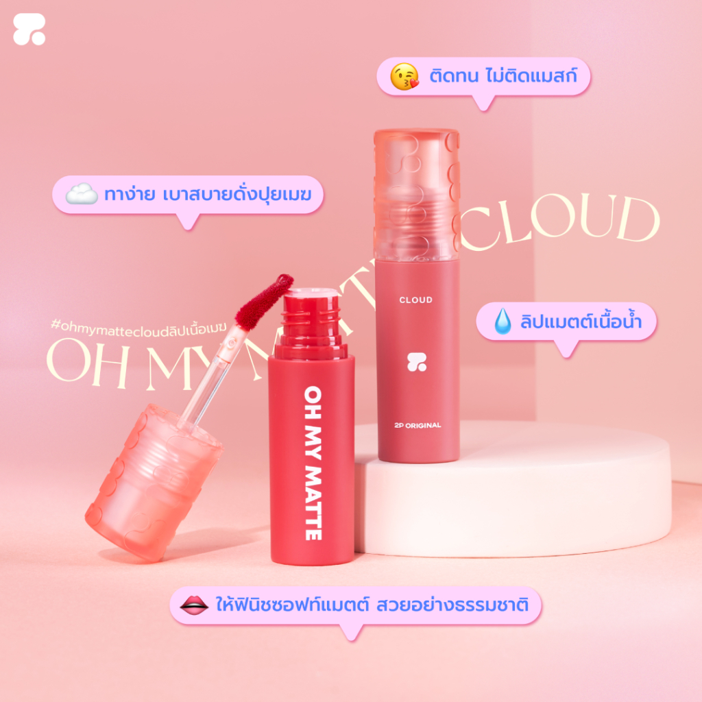 OH MY MATTE CLOUD by 2P ORIGINAL #ohmymattecloudลิปเนื้อเมฆ “เบาสบาย ไม่ติดแมสก์” ที่สุดเท่าที่เคยมีมา ลิปแมตต์รุ่นใหม่ล่าสุดจากทูพีออรินอล ด้วยสูตรพิเศษที่ให้ความเบาสบาย ไร้น้ำหนักเหมือนเนื้อเมฆ สัมผัสแรกให้ความชุ่มชื้น เมื่อทาจะรู้สึกเย็นสบายปาก และเซ็ทตัวเป็นเนื้อแมตต์ ติดทนยาวนาน กลมกลืน