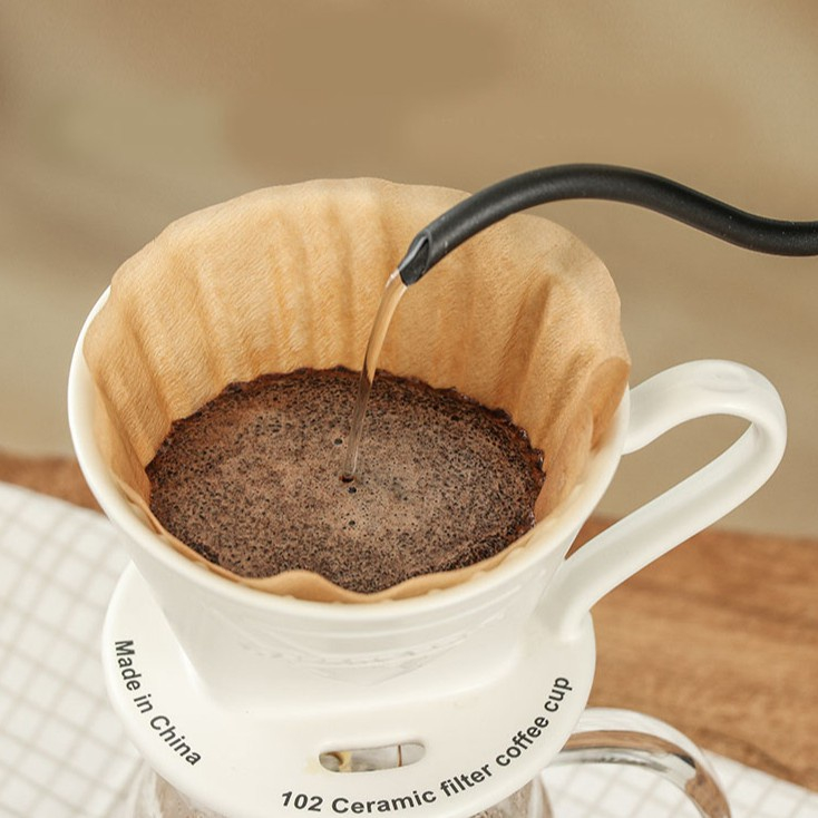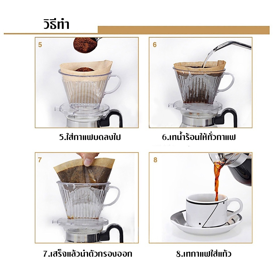 ... หรือ 300ml) ใช้กระดาษเบอร์ 6 (60mm) วิธีการใช้งาน 1.พับขอบกระดาษด้านที่เป็นรอยเย็บ (สำคัญมาก) และนำกระดาษกรองใส่เข้าไปในกรวยดริปกาแฟ 2.ใส่กาแฟที่บดแล้วลงบนกระดาษกรอง 3.เทน้ำร้อนลงบนเนื้อกาแฟให้ทั่ว