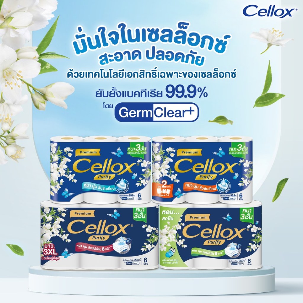 "เซลล็อกซ์ พิวริฟาย พรีเมียม กระดาษทิชชู่ม้วน หนา 3 ชั้น 30 ม้วน Cellox Purify Premium Toilet Tissue 3 ply 30 roll สัมผัส 5 ความพิเศษที่เหนือกว่า กับกระดาษทิชชูคุณภาพดีเยี่ยม เนื้อเหนียว ไม่เป็นขุยแม้เปียกน้ำ เหนือกว่ากระดาษทิชชูทั่วไปด้วยคุณสมบัติพิเศษ 5 ประการ - สะอาดเป็นพิเศษ :สะอาดเป็น