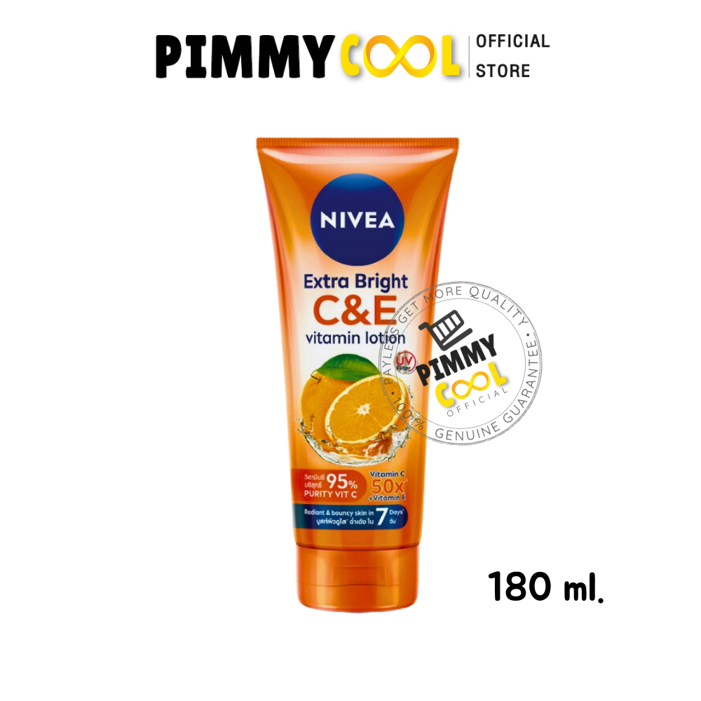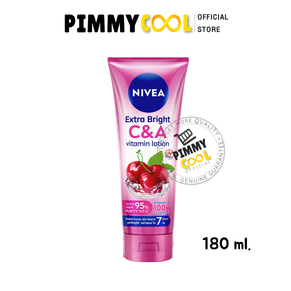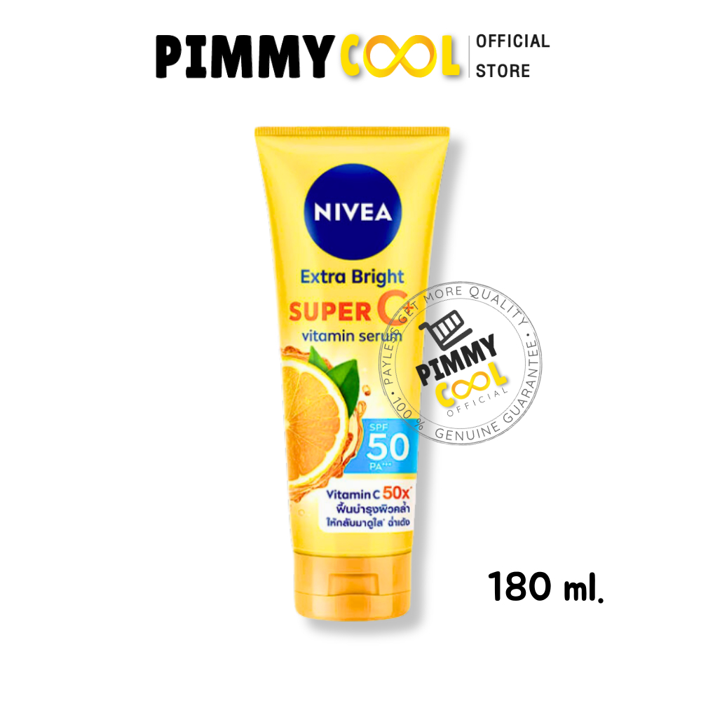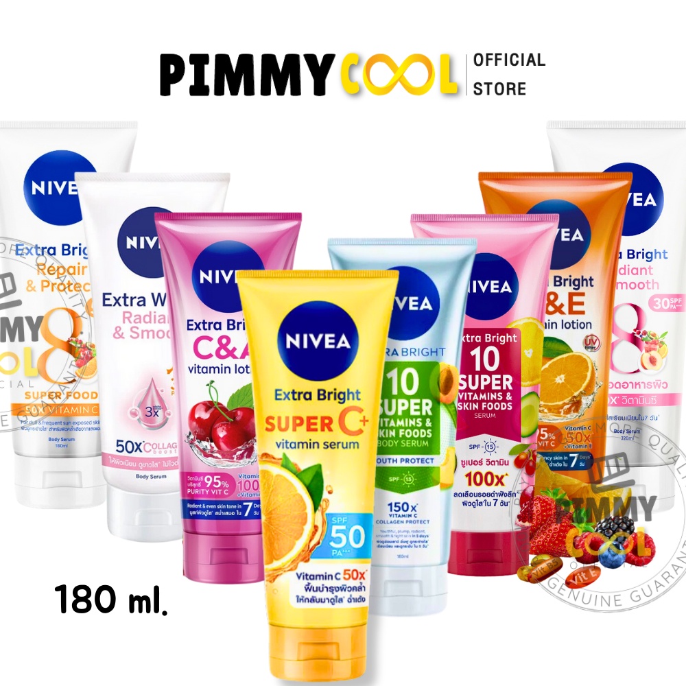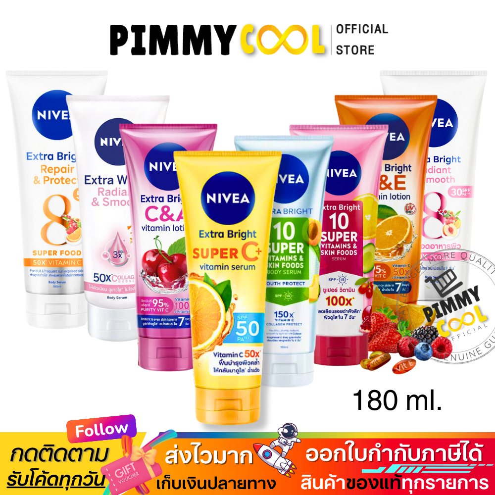 ... ทร์-เสาร์ ตัดรอบ 11.00 ) 👩🏼💻 มีเจ้าหน้าที่คอยตอบแชท แชทเลย ----------------------------------------------------- • ลูกค้ามั่นใจได้ค่ะ ทางร้านรับตรงจากบริษัท ไม่โดนของปลอมแน่นอน • สินค้ารับประกัน 7 วัน เงื่อนไขอยู่รูปสุดท้าย • สินค้าใหม่ : • ร้านพิมมี่คลูต้องมี Logo P ใหญ่สีเหลืองเท่านั้น ----------------------------------------------------- NIVEA Extra Bright 10 Super Vitamins & Skin Food 180ml. - นีเวีย เอ็กซ์ตร้า ไวท์ 10 ซูเปอร์ วิตามิน แอนด์ สกิน ฟู้ด เซรั่ม - เซรั่มบำรุงผิวกายผสาน 10 วิตามินและอาหารผิว - ลดเลือนรอยดำฝังลึก ผิวดูใส NIVEA Extra Bright Super C+ Vitamin serum 180 ml. - วิตามินเซรั่มบำรุงผิวกาย ผสานกันแดด SPF50 PA+++ - เซรั่มเนื้อบางเบา ไม่เหนียวเหนอะหนะ - สูตรบูสท์เตอร์ - อัดแน่นด้วยวิตามินซีมากถึง 50เท่า - จากคามู คามู ช่วยกู้ผิวให้ดูกระจ่างใส NIVEA Extra Bright C and E Vitamin Lotion 180 ml. - ครั้งแรกของวิตามินบำรุงผิวในรูปแบบโลชั่น เนื้อบางเบา ซึมเร็ว - ช่วยบูสท์ผิวให้ดูขาวใส และวิตามินอีเข้มข้นตรงเข้าบำรุงผิวทันที - ปลุกผิวขาวใส ฉ่ำเด้ง NIVEA Extra White C and A Vitamin Lotion 180 ml - เซรั่มเนื้อบางเบา ไม่เหนียวเหนอะหนะ - วิตามิน A 100 เท่า จากเชอร์รี่มิ้นท์สกัดสูตรเย็น - วิตามิน C บูสท์ผิวดูใส สีผิวดูสม่ำเสมอ - สารสกัดจากเมล็ดองุ่น บำรุงผิวให้เนียนนุ่ม ผิวดูอ่อนเยาว์ วิธีใช้ : ลูบไล้ทั่วเรือนร่างเป็นประจำ ใช้ได้บ่อยครั้งตามต้องการ ----------------------------------------------------- ปริมาณสุทธิ : 180 ml เลขอย / เลขที่จดแจ้ง : 11-1-6400037401 ----------------------------------------------------- ทางร้านเลือกสินค้าที่มีคุณภาพค่ะ ใช้กล่องพัสดุอย่างดี ไม่ส่งด้วยถุงพลาสสติก ความคุ้มค่าที่ลูกค้าได้รับ สมกับราคาที่สั่งซื้อแน่นอนค่าาา