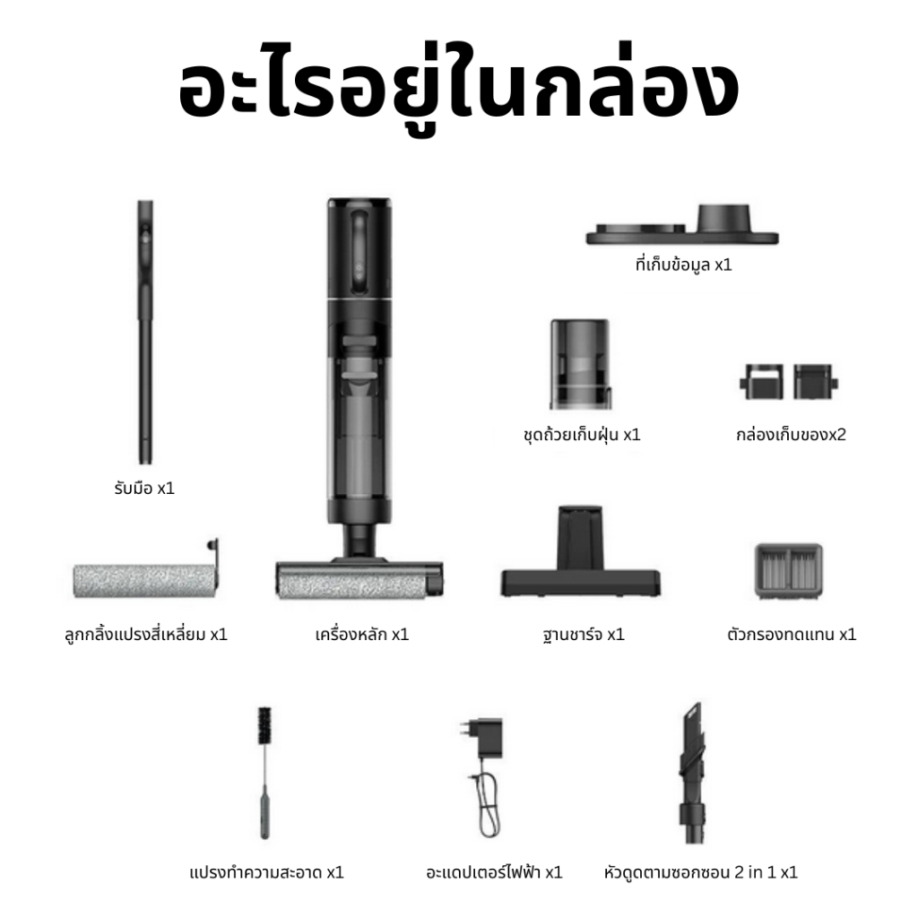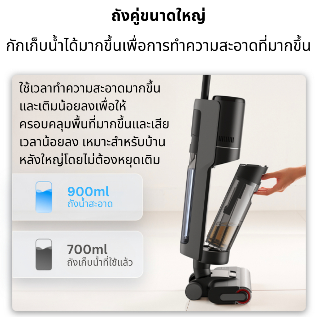 ... ด ๆ พร้อมการรับประกัน 5 ปี 🛒 ขอบคุณสำหรับการสนับสนุนของคุณ เครื่องดูดฝุ่นแบบเปียกและแห้งไร้สาย X8 Pro (X8 Pro) เครื่องดูดฝุ่นแบบเปียกและแห้งไร้สาย ✅️พลังดูดที่ทรงพลัง สูงถึง 550,000 PA โหมดพลังดูดที่ปรับได้ 2 ระดับ: โหมดต่ำ / โหมดสูง ✅️ประหยัดเวลา ไม่สิ้นเปลืองพลังงาน รับประกันความสะอาด ปราศจากฝุ่นและสิ่งสกปรกอย่างแน่นอน ✅️มาพร้อมฟังก์ชันทำความสะอาดตัวเอง กดปุ่มเดียวเพื่อทำความสะอาดตัวเครื่องเอง ✅️ไม่ต้องออกแรงมากด้วยระบบขับเคลื่อนอัตโนมัติ ช่วยขับเคลื่อนไปข้างหน้า เพียงถือเครื่องไปในทิศทางที่ต้องการ ประหยัดพลังงานมากมาย ✅️ดูด-ล้าง-ขัดในเวลาเดียวกัน ไม่ว่าจะเป็นฝุ่น เศษอาหาร สิ่งสกปรก ก็ทำความสะอาดได้ในขั้นตอนเดียว ✅️ถังน้ำ 850 มล. ถังน้ำเสีย 850 มล. ✅️แปรงกลิ้งไมโครไฟเบอร์ ม็อบถูพื้นแบบลูกกลิ้ง สำหรับดูดซับของเหลวและสิ่งสกปรกจากพื้น หมุนด้วยความเร็วสูงสุด 70,000 รอบต่อนาที ช่วยเพิ่มประสิทธิภาพและทำความสะอาดได้หมดจดกว่าเดิม ✅️จอแสดงผลแบบดิจิทัล หน้าจอดิจิทัลแสดงสถานะขณะเครื่องทำงาน ✅️แบตเตอรี่ลิเธียมไออน 4,800 mAh ใช้งานได้ยาวนาน ✅️ฐานชาร์จ มีแท่นชาร์จให้คุณเก็บเครื่องและอุปกรณ์อื่น ๆ ได้อย่างเป็นระเบียบ หลังจากใช้งาน เพียงวางกลับเข้าที่แท่นชาร์จแล้วเสียบปลั๊กเครื่องชาร์จ เพื่อสิ้นสุดกระบวนการชาร์จแบตเตอรี่ ✅️แผ่นกรอง Hepa กรองฝุ่นได้ละเอียด แม้แต่ไรฝุ่นก็ไม่รั่วไหล ✅️รับประกันมอเตอร์ 5 ปี (รับประกันตัวเครื่อง 5 ปี) 📣 ระบบทำความสะอาดตัวเอง ฟังก์ชันทำความสะอาดเครื่องอัตโนมัติ เพียงกดปุ่ม Self-Cleaning ค้างไว้ 3 วินาที เครื่องจะเข้าสู่โหมดทำความสะอาดตัวเองด้วยการฉีดน้ำเพื่อล้างแปรงและช่องดูดสิ่งสกปรก จากนั้นความเร็วในการหมุนของหัวแปรงจะเพิ่มขึ้น เพื่อหมุนหัวแปรงและถูผ้าจนชื้น 📣 ระบบขับเคลื่อนด้วยตัวเอง ระบบขับเคลื่อนไปข้างหน้าที่จะช่วยให้เราไม่ต้องแบกน้ำหนักเครื่อง เพียงแค่เราจับด้ามจับแล้วออกแรงในทิศทางที่ต้องการทำความสะอาด ออกแบบมาเพื่อรองรับการใช้งานสำหรับทุกเพศทุกวัย