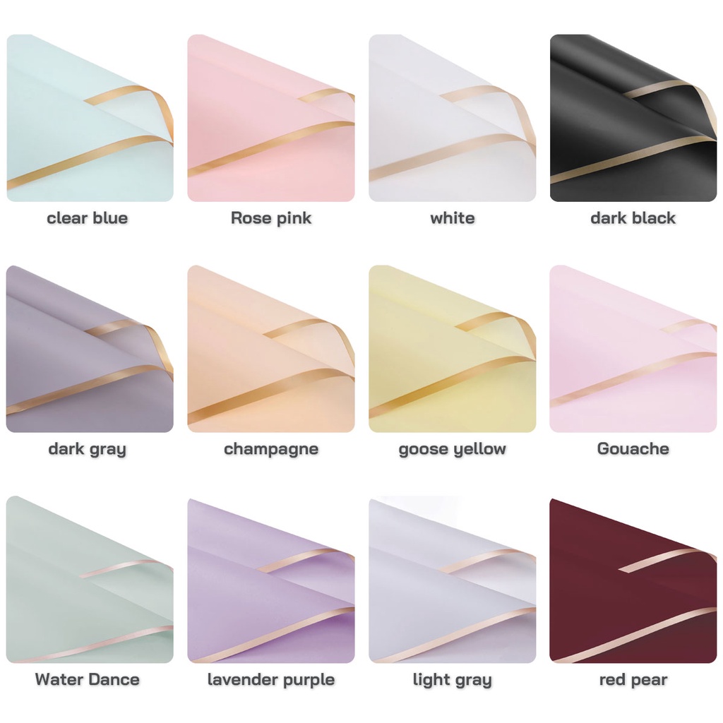-----รายละเอียดสินค้า----- แผ่นพลาสติกห่อช่อดอกไม้ สีพื้นขอบทอง ชื่อ: กระดาษสำหรับห่อช่อดอกไม้ ขนาด: 58 * 58 ซม สี: 11 สี วัสดุ: OPP กันน้ำ ปริมาณ:20 แผ่น/แพ็ค ใช้: ดอกไม้บรรจุภัณฑ์ของขวัญ ใช้สำหรับห่อดอกไม้ และงาน DIY ต่างๆ เป็นของขวัญที่เหมาะสำหรับคนรัก คนในครอบครัว เพื่อนและเพื่อนร่วม