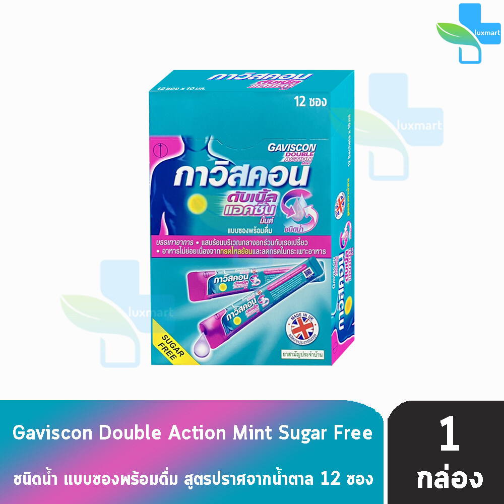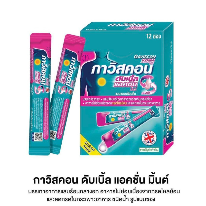 Gaviscon Double Action Mint Flavour 10ml. กาวิสคอน รสมินต์ ซองชมพู 12 ซอง [1 กล่อง] กรดไหลย้อน ยาสามัญประจำบ้านขนาด