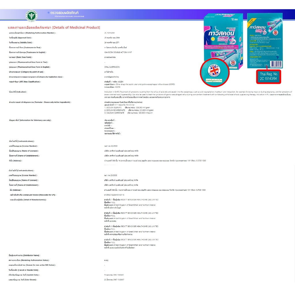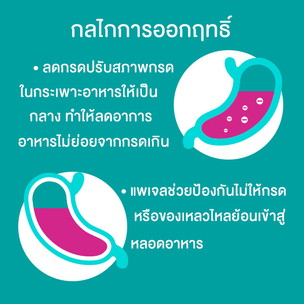 ... ล้เคียงธรรมชาติ ลอยตัวเป็นแพอยู่บนของเหลวในกระเพาะอาหาร ซึ่งช่วยป้องกันภาวะกรดในกระเพาะอาหารไหลย้อนกลับได้อย่างมีประสิทธิภาพ แคลเซียม คาร์บอเนต จะช่วยปรับสภาพกรดในกระเพาะอาหารให้เป็นกลางทำให้ลดอาการอาหารไม่ย่อยจากกรดเกินและอาการแสบร้อนบริเวณ ยอดอก ประสิทธิภาพที่เพิ่มขึ้นจากการเพิ่มปริมาณแคลเซียมคาร์บอเนต ซึ่งมีคุณสมบัติในการปรับสภาพความเป็น กรดในกระเพาะอาหารให้เป็นกลาง โซเดียม แอลจิเนต ในกาวิสคอน ดูอัล แอคชั่น สกัดมาจากสาหร่ายสีน้ำตาลในคาบ สมุทรสแกนดิเนเวีย ส่วนประกอบ Sodium Alginate, Sodium bicarbinate,Calcium Carbonate เลขที่จดแจ้ง 2C 78/51/ ฆท.445/2565 อายุการเก็บรักษา 24 เดือน