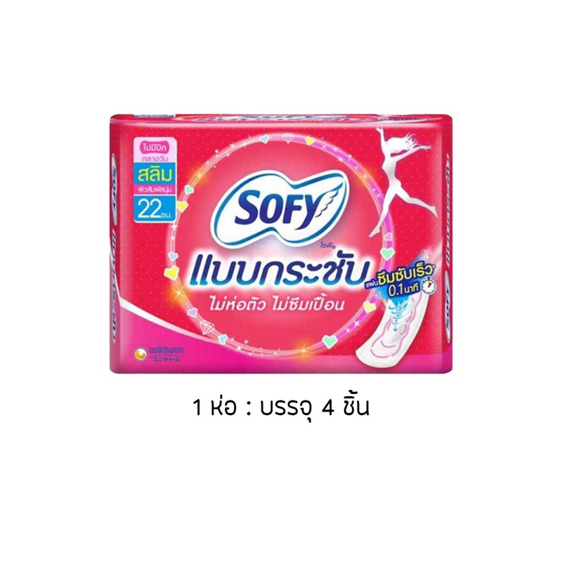 Sofy โซฟีกลางวันแบบกระชับ สลิม มีปีก ยาว 22cm 4ชิ้น (1 แพ็ค 12 ห่อ แถมเพิ่มโซฟีกลางคืน 4 ชิ้น) -ไม่ห่อตัว...ไม่ซึมเปื้อน ...ซึมซับได้ดี แม้ในวันมามาก -แผ่นซึมซับเร็ว 0.1 นาที -แผ่นกระชับกับสรีระ พร้อมยึดแนวซึมซับกลางแผ่นให้คงรูปเดิมเสมอ เคลื่อนไหวท่าไหน ก็ไม่ห่อตัว -ซึมซับได้อย่างรวดเร็ว และเ