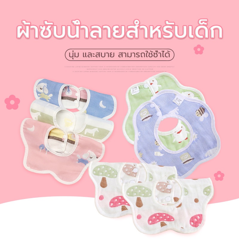 ผ้าซับน้ำลายมีกระดุม ปรับได้2 ระดับ ดูดซับน้ำได้ดี ผ้าฝ้าย100% ผ้าซับน้ำลายสำหรับเด็กแบบรอบคอแต่งโบว์