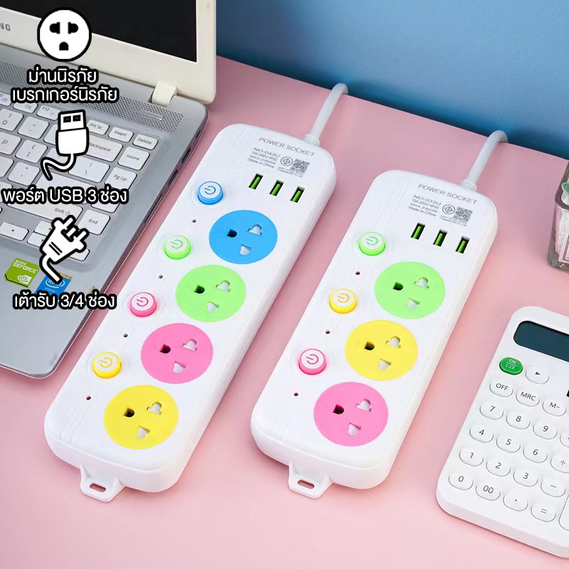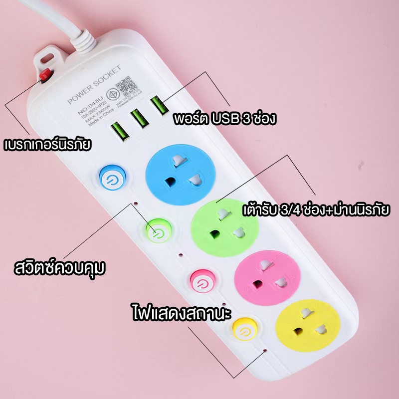 คุณสมบัติ - ปลั๊กพ่วง 3สวิตซ์-3ช่อง / 4สวิตซ์-4ช่อง / 5สวิตซ์-5ช่อง - มีช่อง 3 USB - สวิทช์เปิด-ปิด - สายปลั๊กไฟเป็นแบบ 3 ขา - อุปกรณ์ไฟฟ้าที่ 10 แอมป์ 220 โวลท์ Max Load สูงสุดที่ 2300 วัตต์ - ควรปิดสวิตซ์เครื่องใช้ไฟฟ้าก่อนเสียบปลั๊กทุกครั้ง - ถอดปลั๊กทุกครั้งหลังใช้งานเสร็จ ข้อควรระวั