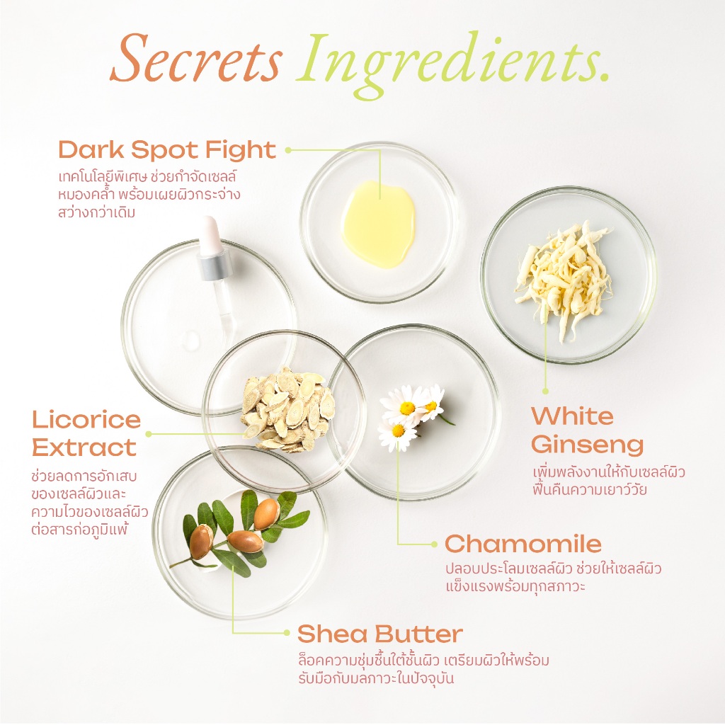 ... งผิวให้ล้ำลึกมากยิ่งขึ้น เน้นปรับสมดุลผิว สร้างผิวสวยอิ่มฟูดูอ่อนเยาว์ พร้อมอัพผิวขาวกระจ่างขึ้นอีกระดับแบบดูเป็นธรรมชาติ ปกป้องผิวจากแสงแดด คงความชุ่มชื้นยาวนาน ด้วยนวัตกรรม Fixible Film เสริมประสิทธิภาพการแต่งหน้าให้ติดทน พร้อมรับขั้นตอนการแต่งหน้า ใช้ได้กับทุกเฉดสีผิว ✨ Triple Function รวม 3 คุณประโยชน์ในหนึ่งเดียว Boosting. Primer. Moisturizer. 🌼 Fleen Beauty’s Secret Ingredients Aquaporin สารสกัดหลักที่ได้รับรางวัล Nobel Prize ตัวช่วยเปิดประตูเซลล์รับการบำรุงที่ล้ำลึก พร้อมเติมน้ำให้ผิวและกักเก็บความชุ่มชื้นได้นานกว่าทั่วไปถึง 5 เท่า 🌸 สารสกัดจากดินแดนตะวันออกทั้ง 5 ชนิด ✧ Dark Spot Fight เทคโนโลยีพิเศษ ช่วยกำจัดเซลล์หมองคล้ำ พร้อมเผยผิวกระจ่างสว่างกว่าเดิม ✧ Licorice Extract ช่วยลดการอักเสบของเซลล์ผิวและความไวของเซลล์ผิวต่อสารก่อภูมิแพ้ ✧ White Ginseng เพิ่มพลังงานให้กับเซลล์ผิวฟื้นคืนความเยาว์วัย ✧ Chamomile ปลอบประโลมเซลล์ผิว ช่วยให้เซลล์ผิวแข็งแรงพร้อมทุกสภาวะ ✧ Shea Butter ล็อคความชุ่มชื้นใต้ชั้นผิว เตรียมผิวให้พร้อมรับมือกับมลภาวะในปัจจุบัน ♡ วิธีใช้ : 1. หยด 3-5 หยด บนใบหน้า (ตามความต้องการ) 2. เกลี่ยให้เนียนทั่วใบหน้าและลำคอ เพื่อให้เซรั่มซึมซาบเข้าสู่ผิว และโทนอัพแตกตัวพร้อมปรับเฉดสีผิวให้กระจ่างขึ้นอีกระดับ 🅧 Free Form 🅧 Vegan - ไม่มีส่วนผสมที่มาจากสัตว์ Paraben Free - ไม่มีส่วนผสมของพาราเบน Alcohol Free - ไม่มีส่วนผสมของแอลกอฮอล์ Fragrance Free - ไม่มีส่วนผสมของนำหอม Mineral Oil Free - ไม่มีส่วนผสมของน้ำมันหอมระเหย Cruelty Free - ไม่มีการทดลองกับสัตว์ ♡ ปริมาณสุทธิ 30 ml. ♡ เลขที่ใบจดแจ้ง : 10-1-6600029788 📣 เงื่อนไขการเปลี่ยนสินค้า สามารถส่งหลักฐานแจ้งเคลมสินค้าที่มีปัญหา ได้ภายใน 7 วันหลังได้รับสินค้า ในกรณีที่มีการเปลี่ยนสินค้า ต้องส่งคืนสินค้าที่มีปัญหาคืนบริษัทฯ