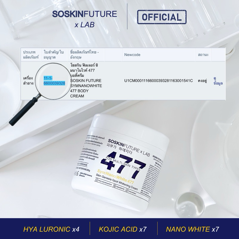 ✅ ของแท้ บริษัทโดยตรง ✅ 🔸🔹 SOSKIN Future x Lab 477 🔹🔸 SymNanoWhite For Mlti-Skin Type ☑️โซลสกิน ฟิลเจอร์ เอ๊กส์ แลป 477 ซิมนาโนไวท์ ฟอร์ มัลติ สกิน ไทป์ ผลิตภัณฑ์ครีมบำรุงผิวกายสูตรเข้มข้น เนื้อบางเบา มีสารป้องกันแสงแดด ซึมซาบไว เกลี่ยง่าย ไม่เหนียวเหนอะหนะ เนื่องจากมีสารป