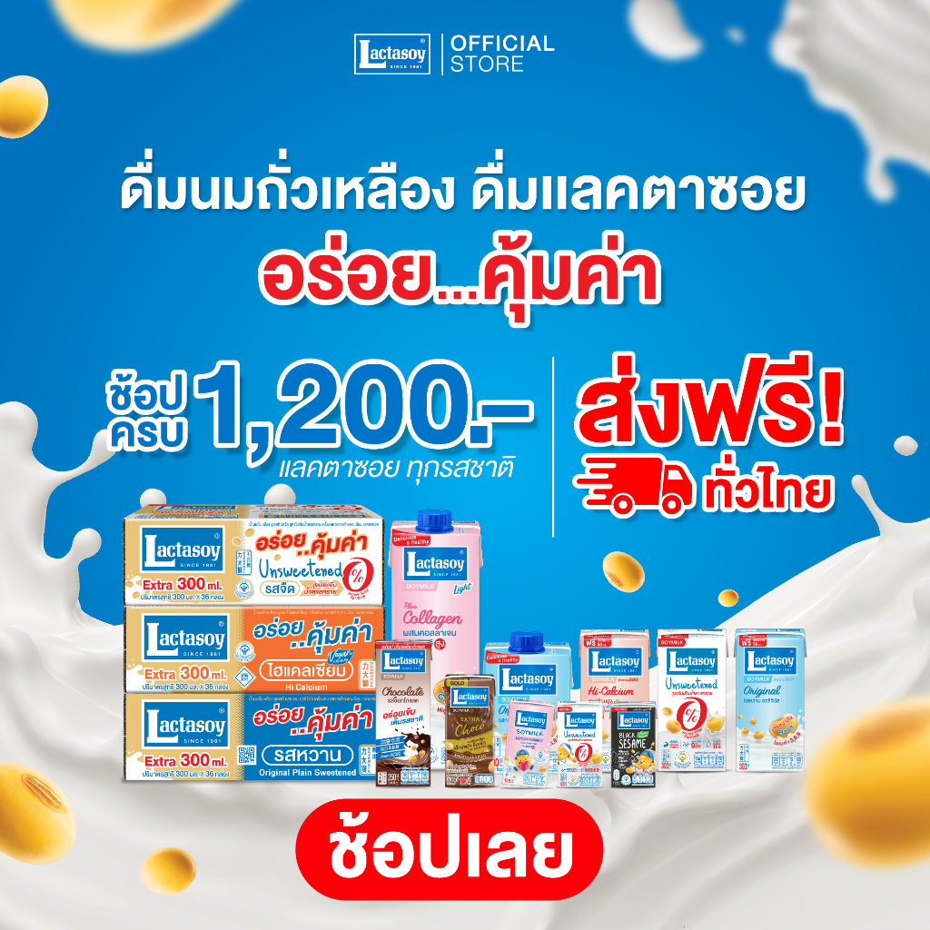 ... ่า 30 ปี ส่วนประกอบ : น้ำนมถั่วเหลือง 89.2% , น้ำตาล 7.0% นมผงธรรมดา 2.0% , ไขมันพืช 1.7% น้ำนมถั่วเหลืองแลคตาซอย สูตรต้นตำรับ : มีกรดอะมิโน 9 ชนิด ซึ่งมีความจำเป็นต่อร่างกาย มีกรดไขมันไม่อิ่มตัว ในถั่วเหลืองสามารถช่วยลดระดับคอเลสเตอรอล มีเส้นใยอาหารจากถั่วเหลือง สามารถช่วยลดระดับน้ำตาลในเลือดของผู้ป่วยเบาหวาน ช่วยป้องกันการขาดแคลเซียม ช่วยกระตุ้นการเจริญเติบโตของกระดูก ช่วยลดความรุนแรงของโรคกระดูกผุ ช่วยป้องกันโรคโลหิตจาง เนื่องจากถั่วเหลืองมีธาตุเหล็กสูง ช่วยปรับสภาพของฮอร์โมนในสตรีให้สมดุล ช่วยลดความรู้สึกไม่สบายตัว อาการร้อนวูบวาบในระยะหมดประจำเดือนของสตรี พร้อมกันนั้น การดื่มนมถั่วเหลืองอุ่น ๆ ในทุกเช้าจะช่วยเสริมสร้างโปรตีนให้พลังงานแก่ร่างกาย ดื่มก่อนนอนจะช่วยทำให้นอนหลับสบายยิ่งขึ้น