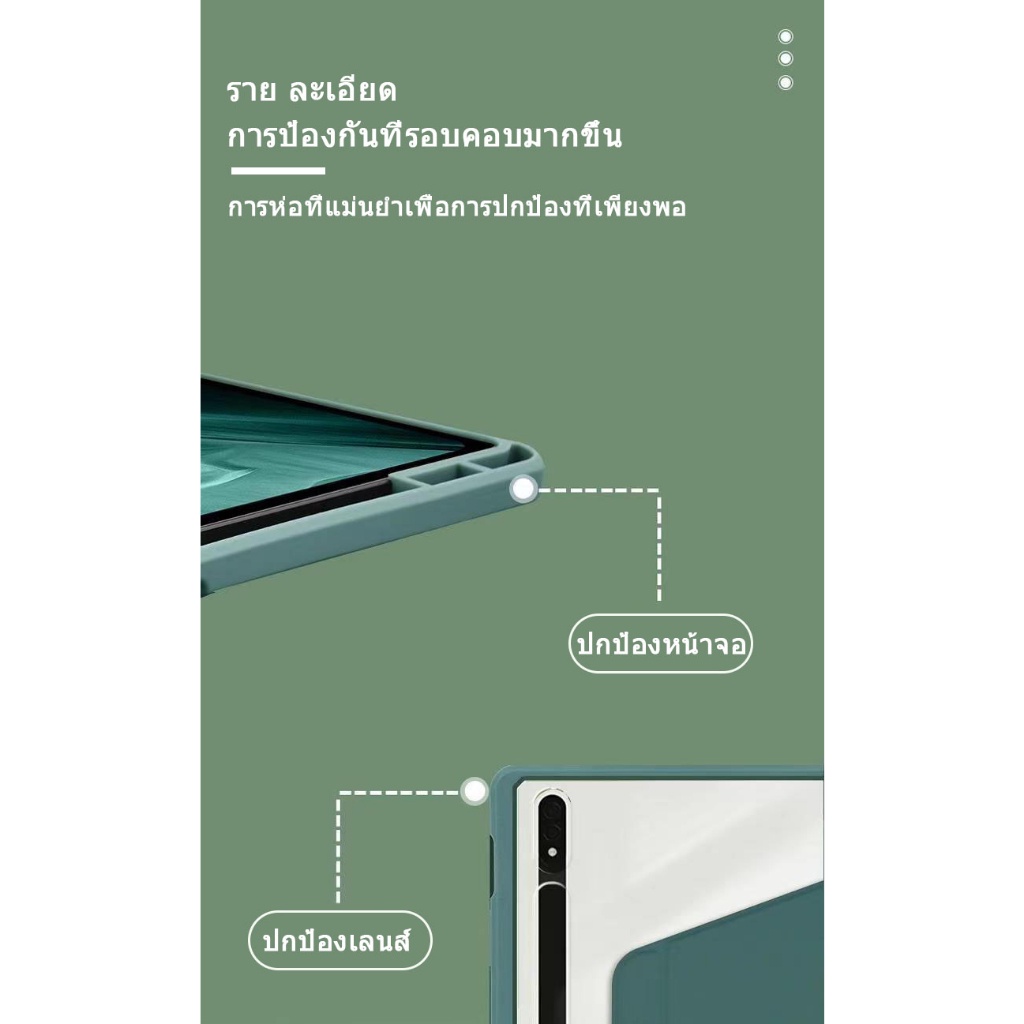 ... กแบบ 4 มุมที่หนาขึ้น, ป้องกันการหล่นและกันกระแทกช่องเปิดที่ถูกต้อง ขาตั้งมุมปรับได้ 360 องศา (1) หมุนได้ 360 องศาขาตั้ง: เปลือกหลังสามารถหมุนได้ 360 องศารองรับมุมมองที่หลากหลายเพื่อให้ตรงกับความต้องการของทุกคนสำหรับมุมต่างๆ ที่ใส่ดินสอในตัว (2): คว้าดินสอรุ่นที่ 2 ของคุณได้อย่างง่ายดายทุกเมื่อที่คุณต้องการพกพาปากกาไปด้วยอุปกรณ์ของคุณได้อย่างง่ายดาย (3) การป้องกันเพิ่มเติมสำหรับเลนส์: จากความเสียหายจากการตกกระแทก ฝาหลังฮาร์ดเชลล์ (4): ฝาหลังฮาร์ดเชลล์แบบยืดหยุ่นช่วยปกป้องแท็บเล็ตของคุณจากแรงกระแทกหยดและแรงกระแทก เปลือกหลัง Hard Crystal Clear (5): การป้องกันรอยขีดข่วนรักษาความงามดั้งเดิมของแท็บเล็ตพีซี --------------------------------------------------------------------------- ● ฉันจะทราบได้อย่างไรว่าแท็บเล็ตของฉันรุ่นอะไร 👉🏻Samsung Galaxy Tab S6 Lite WIFI/4G【P610/615】 Galaxy Tab A8 2021 10.5 นิ้ว GALAXY Tab S7 11 นิ้ว [T870] Galaxy Tab S8 11 นิ้ว GALAXY Tab S7+ 12.4 นิ้ว【T970】 Galaxy Tab S8+ 12.4 นิ้ว หมายเหตุ: สีอาจมีความแตกต่างเล็กน้อยในชีวิตจริงเนื่องจากความแตกต่างระหว่างหน้าจอคอมพิวเตอร์และความแตกต่างของสีตาเปล่า โปรดตรวจสอบว่ารุ่นและการเลือกสีถูกต้องหรือไม่ก่อนทำการสั่งซื้อ