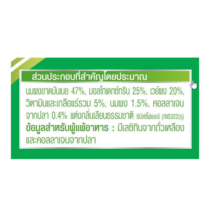 ... ปริมาณ 150 มิลลิลิตร (ประมาณ 3 ใน 4 ของแก้ว) 2.ตักนมผงแอนลีน แอคติฟิต 3 รสจืด 4 ช้อนสั้นปาดเรียบ หรือ 25 กรัม (1ซอง) จากนั้นคนให้เข้ากัน โดยสามารถเพิ่มและลดปริมาณน้ำได้ตามต้องการ FDA 10-3-04232-1-0307 เก็บรักษาได้ 14เดือนนับจากผลิต หรือดูวันหมดอายุที่สินค้า