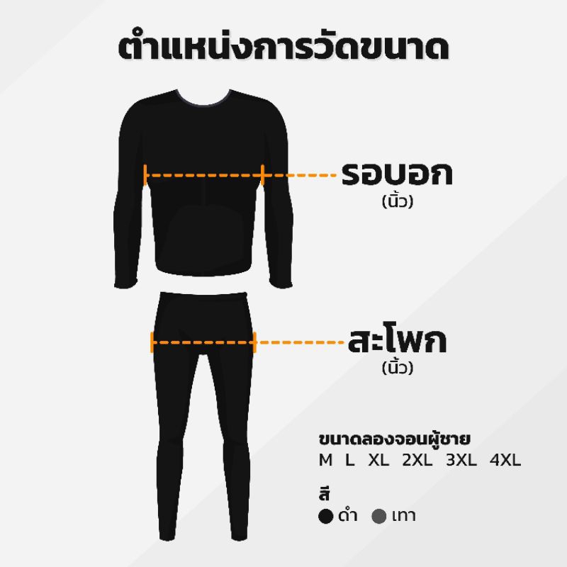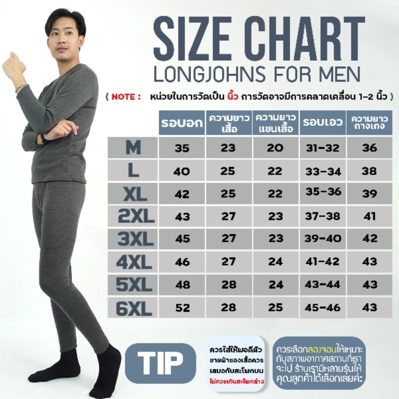 ... จะใส่ไปเที่ยวต่างประเทศหรือสถานที่ท่องเที่ยวที่มีอากาศหนาวก็เหมาะสมเอามากๆ เรียกได้ว่าซื้อไปคุ้มไม่ผิดหวังอย่างแน่นอน👖 🧤วัสดุทำจากผ้าคอตตอน ด้านในบุขนวูล 🧤ด้านในด้วยขนแกะ 80% 🧤1 ชุดมีเสื้อและกางเกง 🧤เหมาะสำหรับผู้ชาย สี : ดำ เทา Size : M L XL XXL XXXL XXXXL 5XL 6XL ตารางไซส์ดูในรูปนะค่ะ ***หมายเหตุ ผู้ชายที่สูงเกิน 178 cm ขึ้นไปแนะนำให้เพิ่มไซส์จากตาราง 1 ไซส์นะค่ะ ***ลองจอนสีเทาผ้ายืดนะค่ะ แต่จะยืดน้อยกว่าสีดำนะค่ะ ถ้าลูกค้าต้องการผ้าที่ยืดเยอะ ทางร้านแนะนำเป็นสีดำนะค่ะ ถ้าลูกค้าสั่งสีเทาแนะนำเลือกไซส์เผื่อ 1 ไซส์ นะค่ะ วิธีการทำความสะอาดและเก็บรักษาชุดลองจอห์น 1.ซักด้วยน้ำอุณหภูมิปกติ ห้ามใช้น้ำอุ่นหรือน้ำร้อน แช่ด้วยน้ำยาซักผ้าแบบอ่อนๆ ก่อนซักประมาณ 10 นาที ขยี้เบาๆ ช่วงเป้าหรือช่วงรักแร้สามารถใช้สบู่ซักผ้าถูได้โดยตรง บีบน้ำออกเบาๆ ***ห้ามใช้แปรงโดยเด็ดขาด 2.ใช้ผ้าขนหนูแห้งห่อช่วยซับน้ำจะทำให้แห้งไวขึ้น หรือ ห่อด้วยผ้าขนหนูนำเข้าเครื่องปั่นแห้ง 3.ตากโดยแขวนในที่ร่ม มีลมโกรกและไม่อับชื้น ถ้าตากในที่อับชื้นผ้าอาจจะไม่แห้งสนิทและเกิดเชื้อราได้ อย่าตากให้โดยแดดโดยตรง จะทำให้เส้นใยผ้าเสื่อมสภาพไวขึ้น 4.เมื่อแห้งแล้วเก็บเข้าตู้ที่ไม่อับชื้น อาจจะใส่ถุงสารดุดความชื้นไว้ในตู้ด้วยก็ได้ สามารถเก็บลงกล่องกระดาษที่อากาศถ่ายเทได้ #ลอนจอน #ลองจอนกันหนาวผู้ชาย #ลองจอนกันหนาว #ลองจอนติดลบ #ฮีทเทค #ลองจอนบุขน