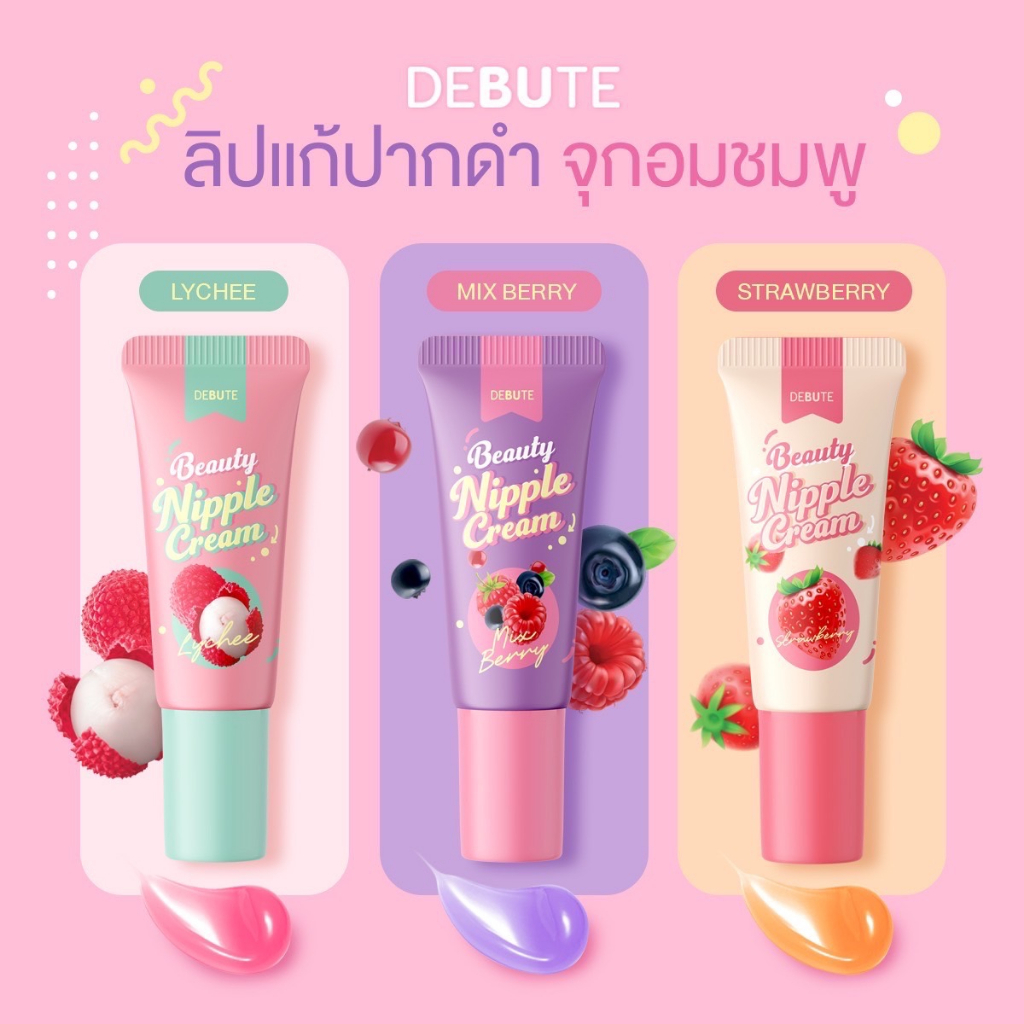 ... ต้องหยุดใช้และปรึกษาแพทย์หรือเภสัชกร ส่วนประกอบ/Ingredients จำนวน 3 เฉดสี DEBUTE BEAUTY NIPPLE CREAM NO.1 AQUA, ACRYLATES/C10-30 ALKYL ACRYLATE CROSSPOLYMER, SIMMONDSIA CHINENSIS SEED OIL, GLYCOLIC ACID, ETHYLHEXYLGLYCERIN, STEVIA REBAUDIANA EXTRACT, POLYSORBATE 20, ALLANTOIN, DISODIUM EDTA, FRAGRANCE, PROPANEDIOL, SODIUM BENZOATE, POTASSIUM SORBATE, MENTHOL, PHYTOSTERYL/OCTYLDODECYL LAUROYL GLUTAMATE, SODIUM HYALURONATE, HYDROLYZED SODIUM HYALURONATE, ETHYLHEXYL PALMITATE, GLYCERYL BEHENATE, LIMNANTHES ALBA SEED OIL, TRIHYDROXYSTEARIN, LITCHI CHINENSIS FRUIT EXTRACT, VACCINIUM ANGUSTIFOLIUM FRUIT EXTRACT, STRAWBERRY FRUIT EXTRACT, CI 45410, CI 14720 DEBUTE BEAUTY NIPPLE CREAM NO.2 AQUA, ACRYLATES/C10-30 ALKYL ACRYLATE CROSSPOLYMER, SIMMONDSIA CHINENSIS SEED OIL, GLYCOLIC ACID, ETHYLHEXYLGLYCERIN, STEVIA REBAUDIANA EXTRACT, POLYSORBATE 20, ALLANTOIN, DISODIUM EDTA, FRAGRANCE, PROPANEDIOL, SODIUM BENZOATE, POTASSIUM SORBATE, MENTHOL, PHYTOSTERYL/OCTYLDODECYL LAUROYL GLUTAMATE, SODIUM HYALURONATE, HYDROLYZED SODIUM HYALURONATE, ETHYLHEXYL PALMITATE, GLYCERYL BEHENATE, LIMNANTHES ALBA SEED OIL, TRIHYDROXYSTEARIN, LITCHI CHINENSIS FRUIT EXTRACT, VACCINIUM ANGUSTIFOLIUM FRUIT EXTRACT, STRAWBERRY FRUIT EXTRACT, CI 45410, CI 14720, CI 42090 DEBUTE BEAUTY NIPPLE CREAM NO.3 AQUA, ACRYLATES/C10-30 ALKYL ACRYLATE CROSSPOLYMER, SIMMONDSIA CHINENSIS SEED OIL, GLYCOLIC ACID, ETHYLHEXYLGLYCERIN, STEVIA REBAUDIANA EXTRACT, POLYSORBATE 20, ALLANTOIN, DISODIUM EDTA, FRAGRANCE, PROPANEDIOL, SODIUM BENZOATE, POTASSIUM SORBATE, MENTHOL, PHYTOSTERYL/OCTYLDODECYL LAUROYL GLUTAMATE, SODIUM HYALURONATE, HYDROLYZED SODIUM HYALURONATE, ETHYLHEXYL PALMITATE, GLYCERYL BEHENATE, LIMNANTHES ALBA SEED OIL, TRIHYDROXYSTEARIN, LITCHI CHINENSIS FRUIT EXTRACT, VACCINIUM ANGUSTIFOLIUM FRUIT EXTRACT, STRAWBERRY FRUIT EXTRACT,CI 45410, CI 14720, CI 19140 เลขที่จดแจ้ง 12-1-6600006034