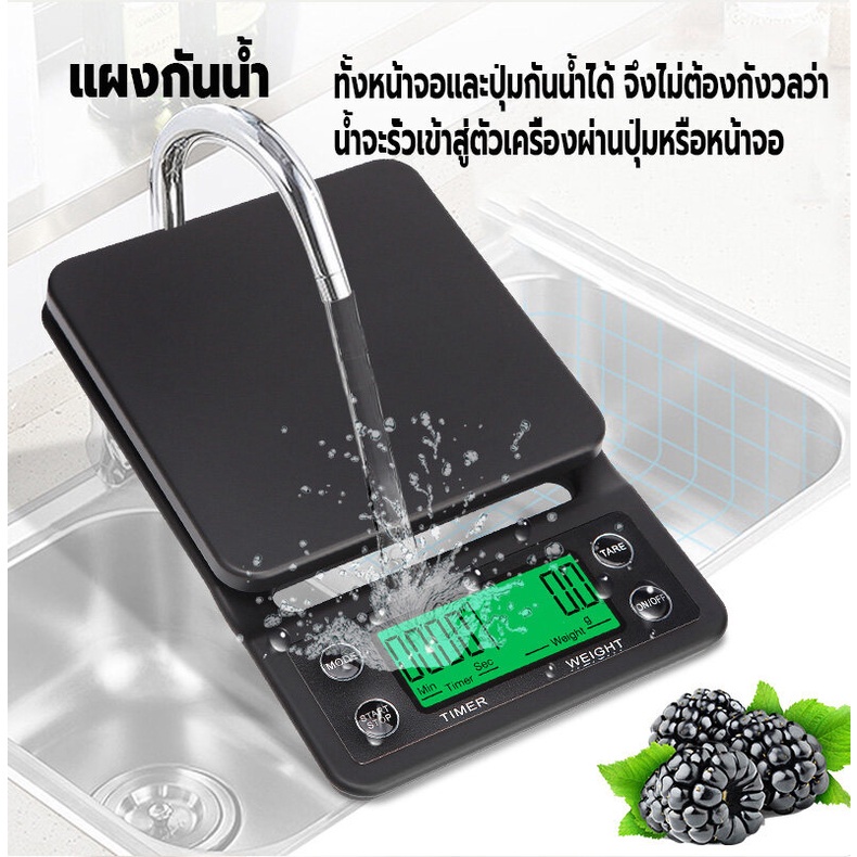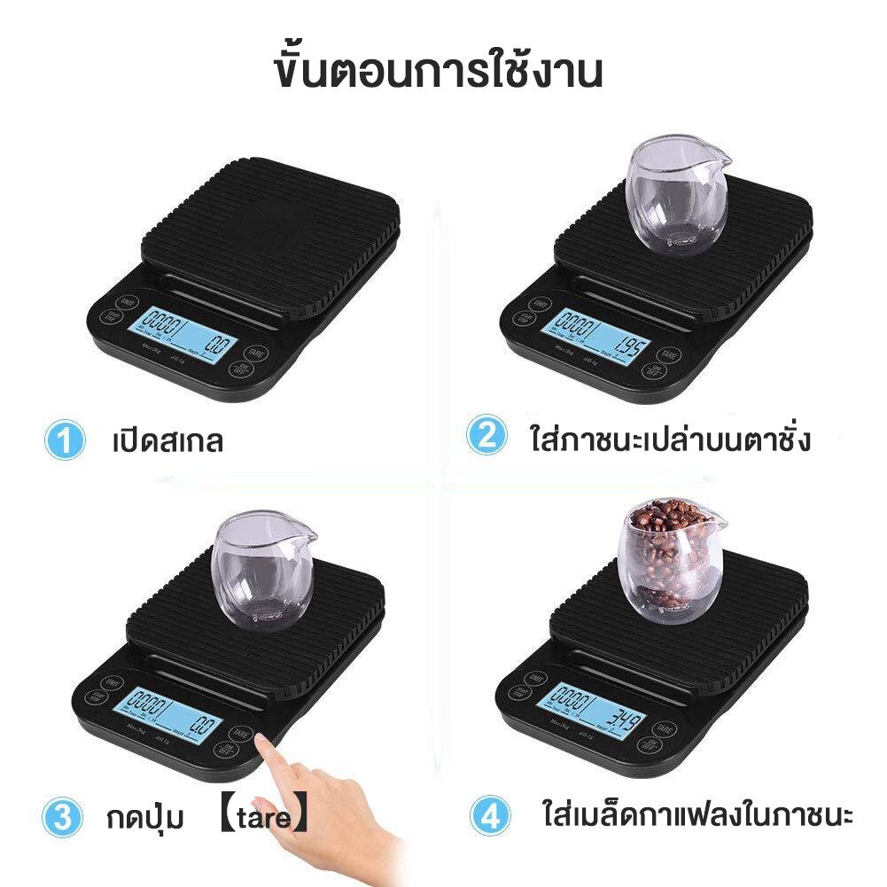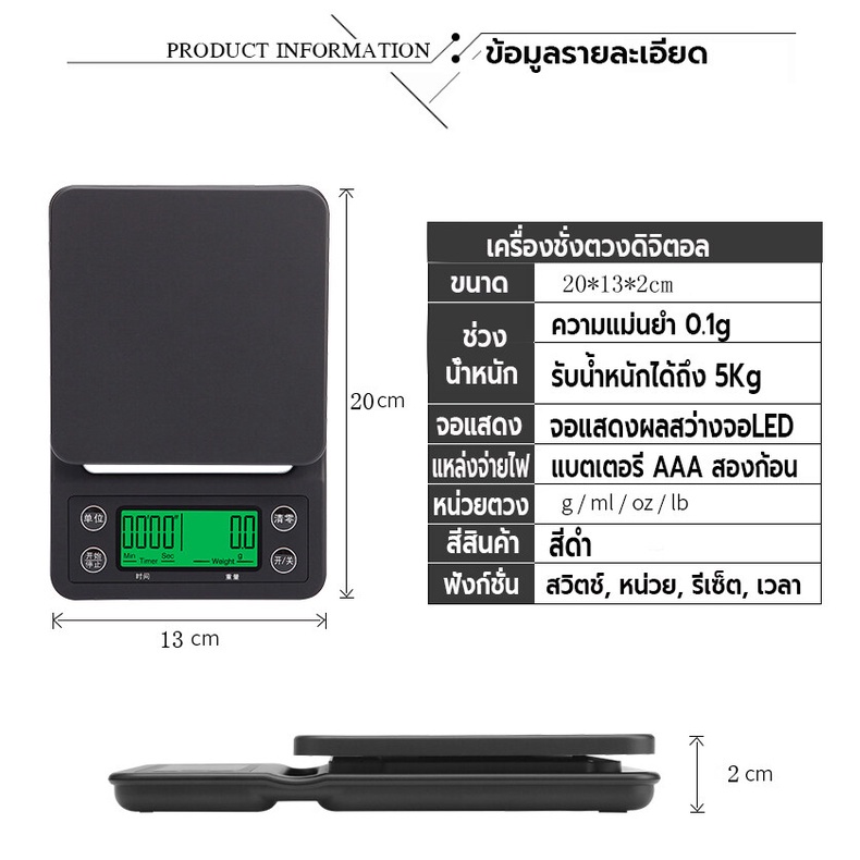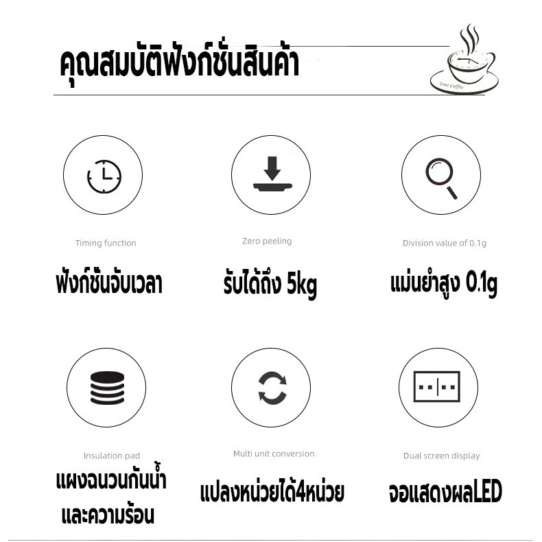 คุณสมบัติ: - มีระบบชั่งน้ำหนัก และจับเวลา ในตัว เหมาะจะใช้สำหรับเป็นอุปกรณ์ช่วยในการชงกาแฟดริป - ฟังก์ชั่นที่หลากหลาย: จับเวลาทำอาหารน้ำหนัก 4 หน่วยเพื่อสลับ g, oz, lb, ml - แม่นยำ: เซ็นเซอร์วัดความเครียดความแม่นยำสูงช่วยให้มั่นใจได้ถึงความแม่นยำ 0.1 กรัม - ตัวเตือนแบตเตอรี่ต่ำ / โอเวอร์โหลด -