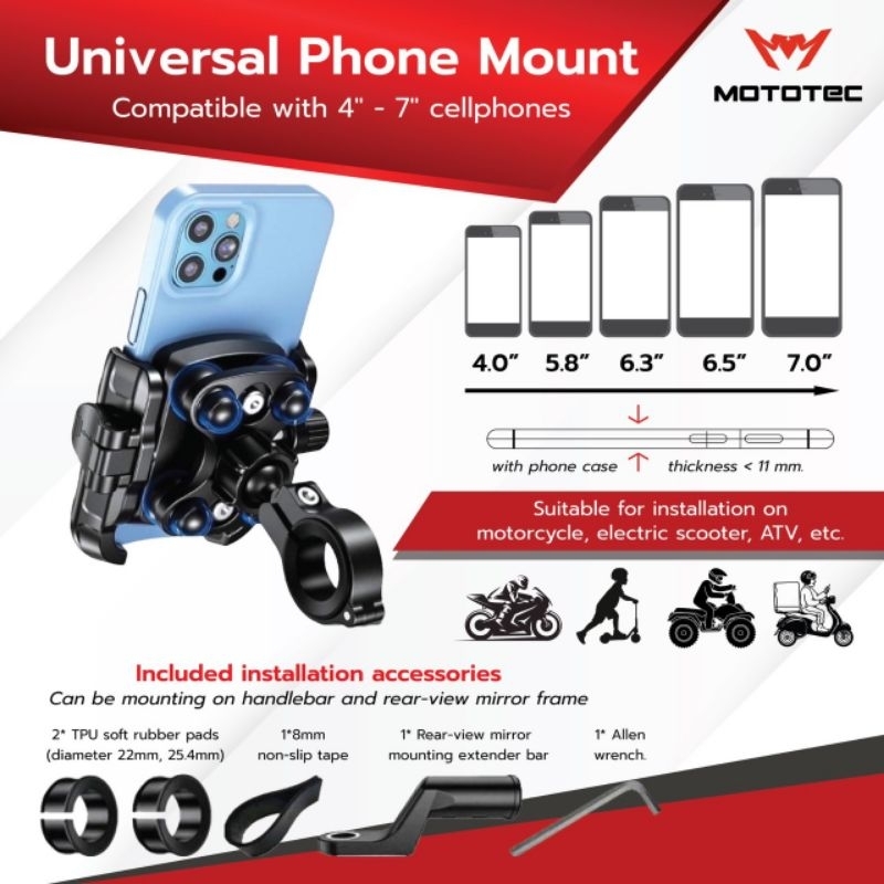 ... นเล็ก ให้สามารถใช้งานในเมืองได้สะดวก สามารถใช้ในชีวิตประจำวันได้ Dampening System ช่วยซับเเรงสั่นสะเทือน เวลาวิ่งทางขรุขระแล้วสั่น ระบบกันสะเทือนจะช่วยซับเเรงสะเทือนไว้บางส่วนไม่ให้เเรงสะเทือนทั้งหมดไปลงที่มือถือ ถ้าไม่มีระบบกันสะเทือน มือถือเราจะรับแรงสะเทือนทั้งหมดที่ส่งมาเต็มๆ โอกาสกล้องที่มีระบบกันสั่น(ois) เช่น iPhone จะพังได้ง่าย กล่าวง่ายๆคือช่วยลดภาระของระบบกันสั่น(ois)ไม่ให้รับภาระหนักมากเกินไปหรือสั่นอย่างนิ่มนวลนั่นเอง - รวมคุณสมบัติเด่น ครบไว้ที่ตัวเดียว ทนทาน รองรับเคสหนา ไม่มีเสียง ปลดไวด้วยนิ้วเดียว วัสดุผสม อลูมิเนียมและวัสดุโพลิเมอร์ ทนน้ำ ทนแดด ทนฝน ไม่ลอกไม่ร่อน ไม่ซีด ทนทานไม่หัก น้ำหนักเบา ไม่มีเสียง ด้วยการดีไซด์ตัวล็อคใหม่ ปลดล็อคและล็อค ได้เร็วเพียงเสี้ยววินาที จับมือถือแน่นไม่คลายตัว ที่จับโทรศัพท์ขนาดใหญ่พร้อมขอบยางกันลื่น รองรับเคสหนาได้ ติดได้ทั้งกระจกและแฮนด์บาร์ (ติดกระจกได้ทั้ง ซ้าย-ขวา) มาพร้อมระบบซับเเรงกระแทก กันสะเทือน เหมาะสำหรับ มอเตอร์ไซด์ จักรยาน มอเตอร์ไซด์แบบ Sport ก็ติดไดั พร้อมยางรัดมือถือเพิ่มความมั่นใจ ครบจบในตัวเดียว รายละเอียดสินค้า ; ที่จับโทรศัพท์มือถือกับรถมอเตอร์ไซด์ ผลิตจากวัสดุ Composite Polymer Material แข็งแรง น้ำหนักเบา ไม่เป็นสนิม ไม่หัก ทนน้ำ ทนแดด ทนฝน สามารถใช้กับรถมอเตอร์ไซต์ได้ทุกรุ่นทุกแบบติดตั้งได้สองตำแหน่งทั้งแบบ แฮนด์บาร์และแบบก้านกระจก ใช้งานง่าย ในครั้งแรกหมุนปรับขนาดให้พอดีกับโทรศัพท์ ที่ตัวหมุนด้านซ้าย ครั้งต่อไปสามารถใช้ตัวล็อคปลดไวได้เลย ล็อคและปลดล็อคได้เร็วเพียวเสี้ยววินาที. ล็อกแน่นไม่ขยับ ไม่มีเสียงขณะขับขี่แม้ตอนไม่ติดตั้งโทรศัพท์ ตัวขาจับสามารถปรับหมุนได้ 360⁰ ปรับ ก้ม-เงย ปรับ ซ้าย-ขวา โดยใช้ระบบ Ball Joint ปรับล็อกได้ ตัวขายึด เป็นอะลูมิเนียม cnc ยาวจนถึงตำแหน่งบอล แข็งแรงไม่หักงอ มาพร้อมยางรองบาร์ขนาด 22 มม.และ 28 มม. ใช้งานได้กับแฮนด์บาร์ทุกขนาด มีอะไหล่ Service ทุกชิ้นส่วน อุปกรณ์ภายในกล่อง ; Mototec MT-QD01 [Plus] - ที่จับโทรศัพท์มือถือแบบปลดเร็ว พร้อมระบบกันสะเทือน - ตัวยึดแฮนด์บาร์หัวบอล รองรับบาร์ขนาด 22 มม.- 28 มม. - ยางรองบาร์สำหรับปรับขนาด และยางรองเสริม - หกเหลี่ยมสำหรับขัน ### สำหรับรุ่น QD01[Plus] จะไม่มีบาร์สั้นมาในชุด Mototec MT-QD02 [Plus] - ที่จับโทรศัพท์มือถือแบบปลดเร็ว พร้อมระบบกันสะเทือน - ก้านสำหรับติดรูกระจกวัสดุอลูมิเนียมพร้อมหัวบอล - ยางรัดมือถือช่วยกันมือถือหลุด Mototec MT-QD05 [Plus] - ที่จับโทรศัพท์มือถือแบบปลดเร็ว พร้อมระบบกันสะเทือน - ตัวยึดที่(แกน)ก้านกระจก รองรับแกนขนา