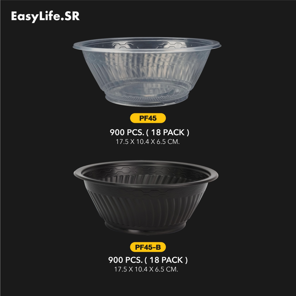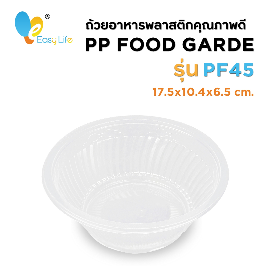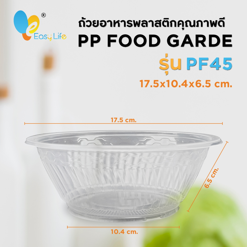 ถ้วยพลาสติกรุ่น PF45 (ไม่มีฝาปิด)ขนาด : ก้นถ้วยกว้าง 10.4cm./ ปากถ้วยกว้าง 17.5cm. /ความสูง 6.5cm.บรรจุ : 50ชิ้น/แพ็ค- สามารถทนความร้อนได้ เข้าไมโครเวฟได้ไม่เกิน 110 องศา- โดนความร้อนถ้วยไม่หดไม่ขยาย- สะอาด ปลอดภัย ได้มาตรฐาน- ใช้ใส่ได้ทั้งร้อนและเย็น - ใส่อาหารได้หลากหลาย แกงต่างๆ อาหารตามสั่ง ยำ ข