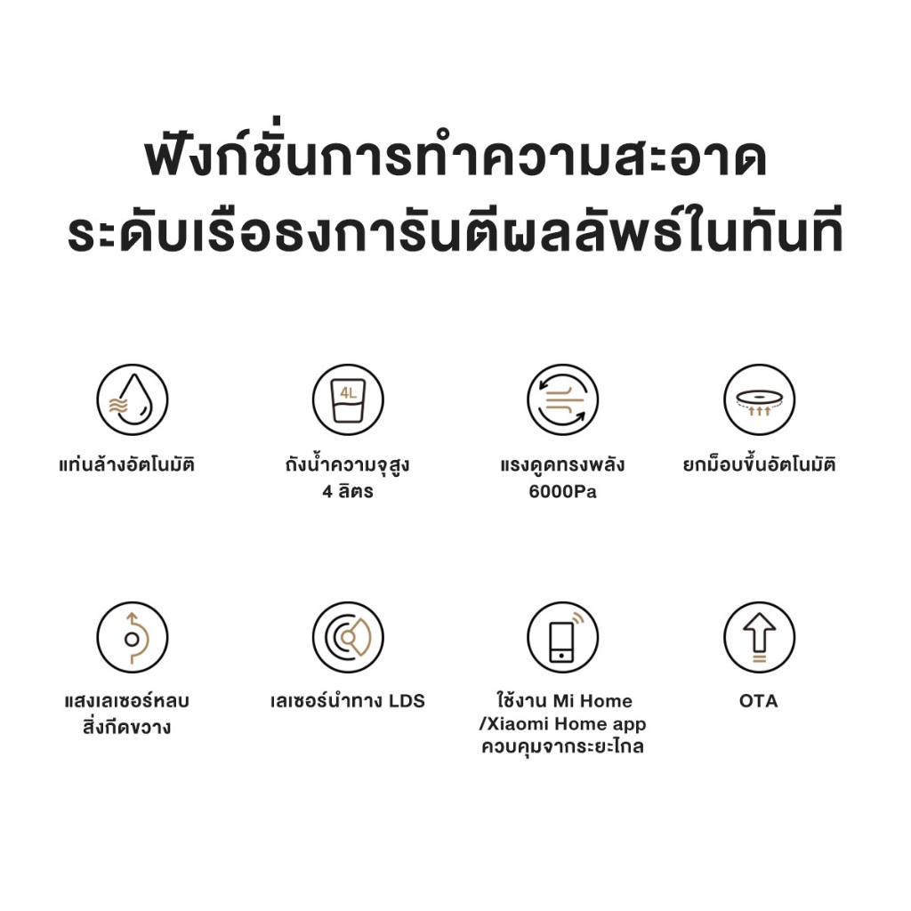 ... น้ำเสีย เพื่อใช้ในการถูพื้น และซักผ้า - ระบบผ้าถูแบบหมุน 2 ชิ้น เพื่อการถูที่มีประสิทธิภาพมากขึ้น - แรงดูดสูงสุด 6000 Pa อุปกรณ์ในกล่อง หุ่นยนต์ดูดฝุ่น x1 ฐานแท่นทำความสะอาดครบวงจร x1 (รวมถุงเก็บฝุ่น, ถังเก็บน้ำสะอาด, ถังเก็บน้ำสกปรก,เพลทซักล้าง) แปรงหลัก x1 (ติดตั้งมาให้) ฝาครอบแปรง x1 (ติดตั้งมาให้) ถุงเก็บฝุ่น x1 (ติดตั้งมาให้) ถังเก็บฝุ่น x1 (ติดตั้งมาให้) ผ้าม็อบถูพื้น x2 (ติดตั้งมาให้) เพลทติดผ้าม็อบถูพื้น x2 แปรงด้านข้าง x1 สายไฟ x1 คู่มือผู้ใช้ x1 -️ เงื่อนไขการรับประกัน 1.สินค้าของแท้ 100% รับประกันศูนย์ไทย1ปี เงื่อนไขการรับประกันบางกรณีอาจมีค่าใช้จ่ายเพิ่มเติมค่ะ 2.กรณีสั่งสินค้าผิดรุ่น ผิดสี ทางร้านขอสงวนสิทธิ์ไม่รับเปลี่ยนหรือคืนสินค้า รบกวนตรวจสอบให้ถี่ถ้วนก่อนกดสั่งนะคะ 3..กรณีเครื่องมี รอยตำหนิ / หน้าจอแตก / ตัวเครื่องมีรอยบุบ / แตก ต้องแจ้งภายใน 24 ชม. ** พร้อมภาพถ่าย วิดีโอตอนแกะกล่องสินค้า ** หากไม่มีหลักฐาน ข้อมูลตามที่ทางร้านแจ้งไปข้างต้น ทางร้านขอสงวนสิทธิ์ในการ เคลมสินค้า/เปลี่ยนสินค้าใหม่ ทุกกรณีค่ะ !! 4.กรณีใส่ที่อยู่ผิด ทางร้านไม่สามารถแก้ไขให้ได้ ลูกค้าต้องยกเลิกแล้วสั่งสินค้าเข้ามาใหม่ 5.ผู้ซื้อต้องเก็บกล่องบรรจุภัณฑ์เพื่อใช้ในการยืนยันในการซื้อสินค้ากับทางร้าน กรณีที่อยู่ในการรับประกัน หากไม่มีกล่อง หรือ เอกสารของทางร้าน ทางร้านขอสงวนสิทธิ์ ถือเป็นที่สิ้นสุดการรับประกันสินค้า **การประกันสินค้านี้ไม่รวมถึงอุปกรณ์ต่อพ่วง หรือของแถมอื่น ๆ ที่มีมาในกล่อง เช่น สายชาร์จที่แถมมาในกล่องปลั๊กรุ่นต่าง ๆ 6.การรับประกันสินค้าไม่ครอบคลุมถึงสินค้าที่เป็นของแถม ในช่วงระยะเวลารับประกันคุณต้องจ่ายค่าขนส่งด้วยตัวเอง 7.สภาพสินค้าที่เกิดความเสียหายจากผู้ใช้ เช่น แตก ชำรุดบุบ ไหม้ มีคราบน้ำ คราบสนิม เป็นต้นถือว่าสิ้นสุดการรับประกัน 8.ไม่รับเปลี่ยนหรือคืนสินค้าที่เกิดจากการใช้งานที่ผิดวิธี หรือการสั่งซื้อที่เกิดความผิดพลาดของลูกค้า ไม่ว่ากรณีใด ถ้าอุปกรณ์เสริมเมนบอร์ดเสียหายจากการใช้งานของลูกค้าเองหรือหากอยู่ในระยะเวลารับประกัน แต่ต้องเปลี่ยนอุปกรณ์เสริมเมนบอร์ด ลูกค้าจะต้องจ่ายค่าซ่อมอุปกรณ์และค่าขนส่งเอง 9.กรณีสินค้ามีปัญหาด้านการจัดส่งหรือสูญหาย รบกวนแจ้งกลับเพื่อตรวจสอบภายใน 15 วันหลังมีการส่งออก ทางร้านไม่สามารถ ตรวจสอบหาเกินเวลาที่กำหนด และขอสงวนสิทธิ์ในการชดเชยทุกกรณี 10. สอบถามเพิ่มเติม / บริการหลังการขาย ลูกค้าสามารถทักแชทร้านได้