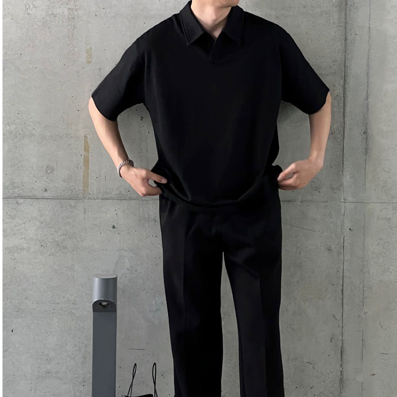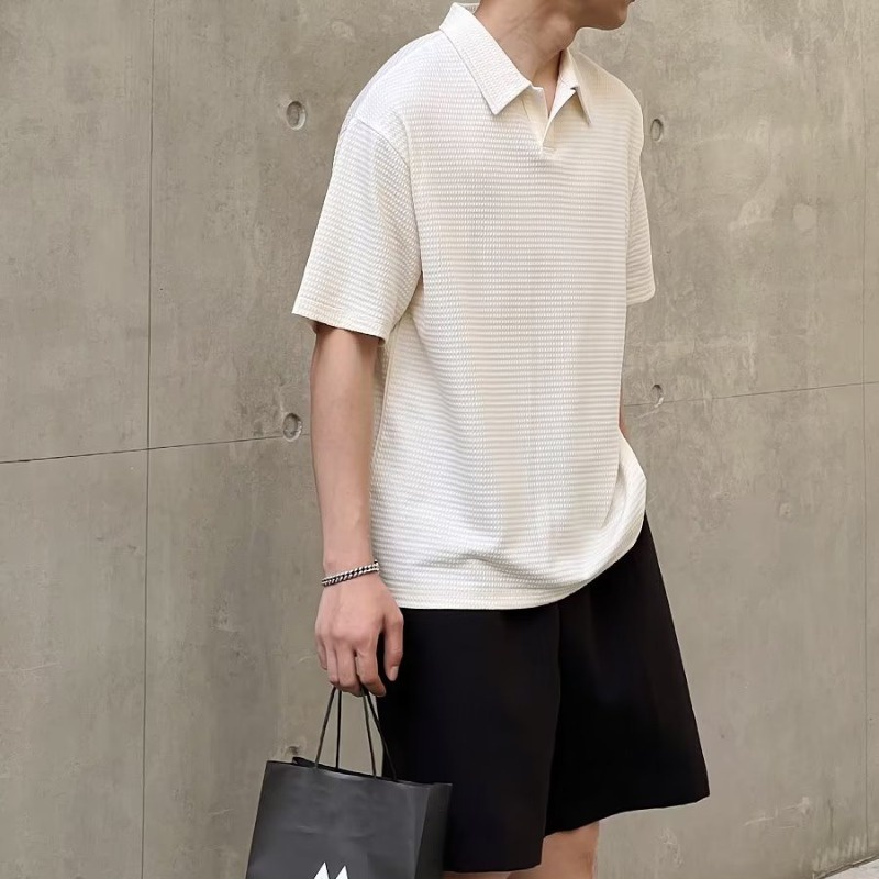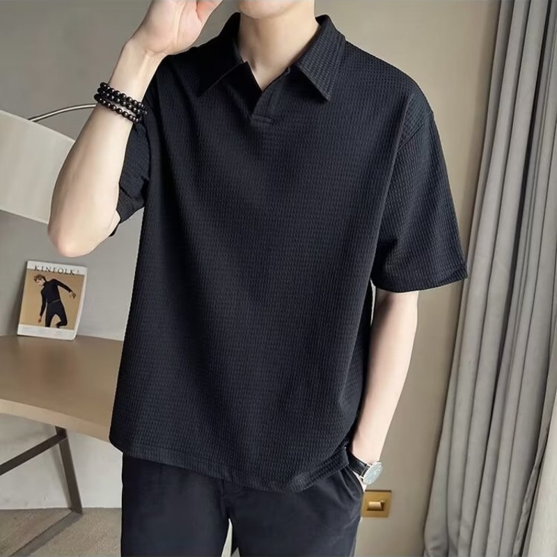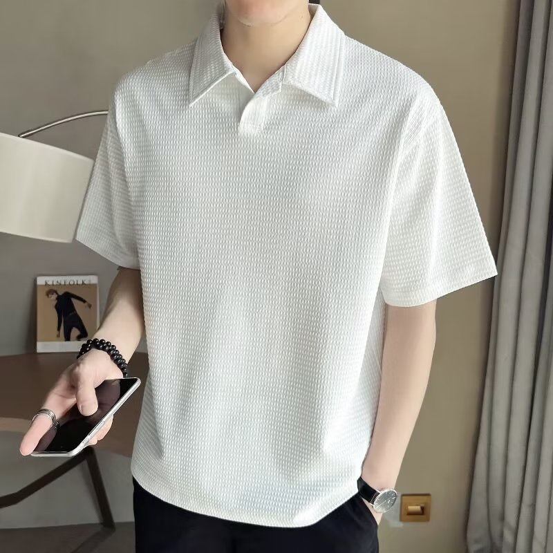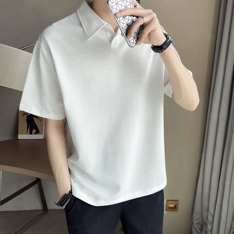 เสื้อโปโลแขนสั้น ผ้าเรยอน ลายวาฟเฟิล แฟชั่นสไตล์เกาหลี สําหรับผู้ชาย