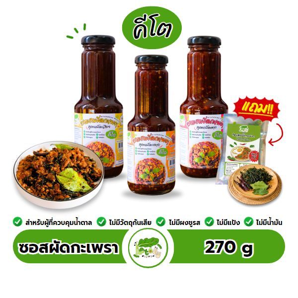 ซอสผัดกะเพราสำเร็จรูป สูตรคีโต Stir Fried Holy Basil Sauce ซอสอเนกประสงค์สำหรับทำกะเพรา ขนาด 270 กรัม สุดคุ้ม! ✅ ไม่มีวัตถุกันเสีย ✅ ไม่มีแป้ง ✅ ไม่มีน้ำตาล ✅ ไม่มีผงชูรส เหมาะสำหรับสายรักสุขภาพ 📢 พิเศษ คิโตดิ๊จัดให้เมื่อสั่งซอสกะเพราสำเร็จรูปสูตรไหนก็ได้ แถมทันที วัตถุดิบสำหรับผัดกะเพราทั้ง