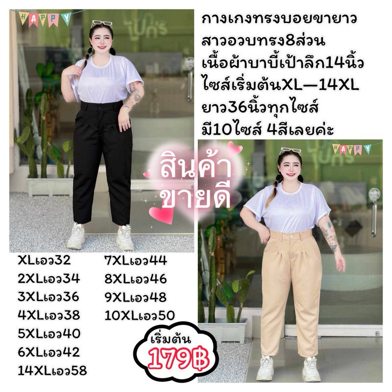 กางเกงทรงบอยขายาวสาวอวบ ไซส์เริ่มต้นXL-48 ถึงเอว58ไซส์พิเศษ ไซส์งานวัดจากหน้าผ้าจริงไม่ต้องเผื่อหรือลดไซส์ มีกระดุมหน้า+ซิปหน้า เอวสูงไม่รั้งเป้า เป้าลึก14นิ้ว ความยาวกางเกง36นิ้วทุกไซส์ ขยับขึ้นตามไซส์ ใส่แล้วขอบเอวอยู่เหนือตะขอ1นิ้ว สูง150-155 ใส่แล้วขาไม่กองไม่ยาวเกินไปพอดีตาตุ่ม สูง155-170 ใส่แล