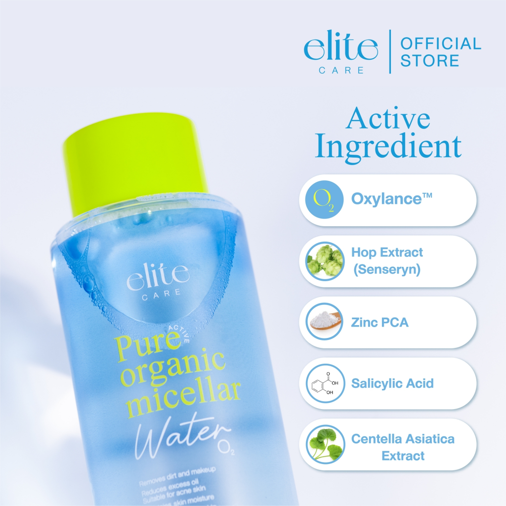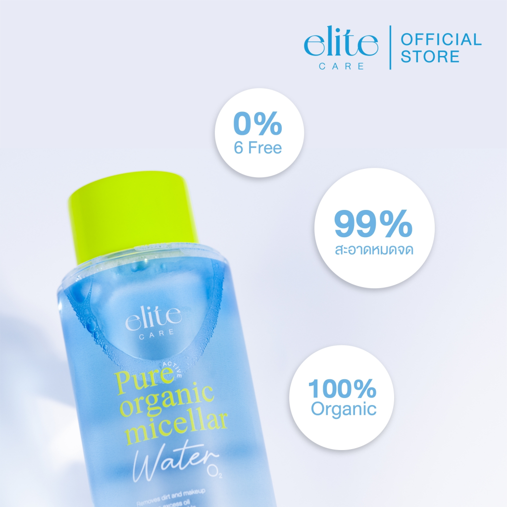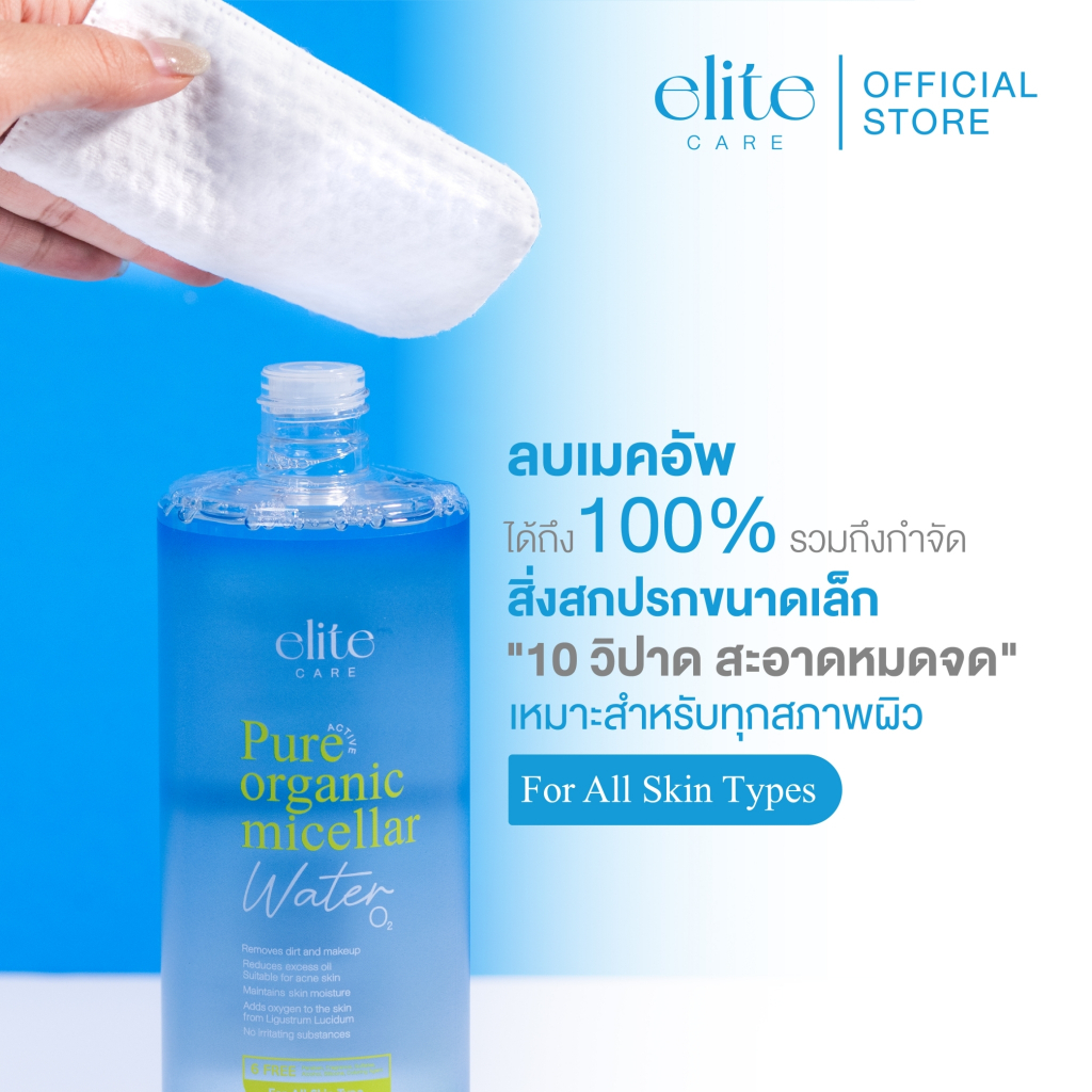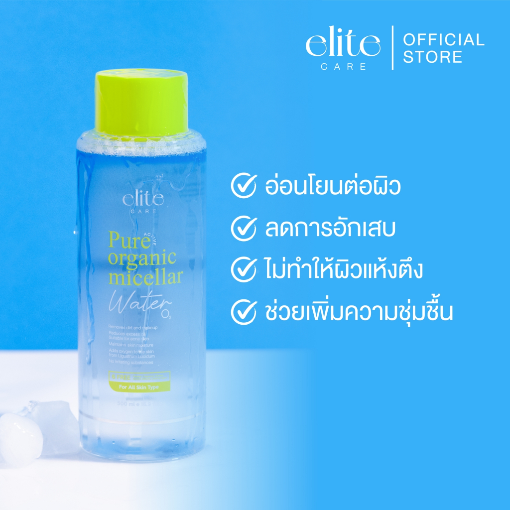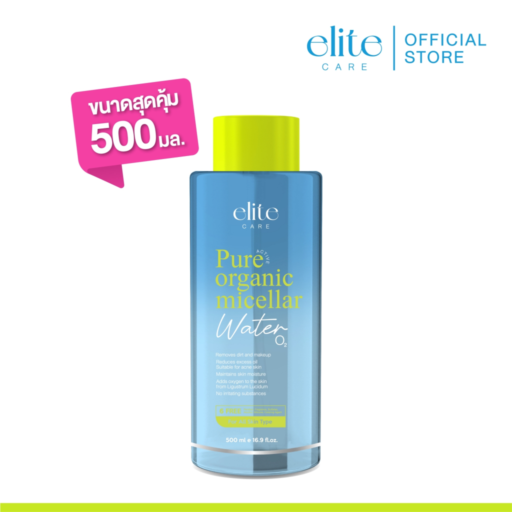 ELITE CARE PURE ACTIVE ORGANIC MICELLAR CLEANSING WATER 500ML อีลิท แคร์ เพียว แอคทีฟ ออร์แกนิค ไมเซล่า คลีนซิ่ง วอเตอร์ 500 มล. “ 10 วิปาด สะอาดหมดจด ” ลบเครื่องสำอางได้สะอาดหมดจด เพิ่มความชุ่มชื่อให้ผิว ผลิตภัณฑ์เช็ดทำความสะอาดเครื่องสำอาง ด้วยนวัตกรรม Micellar ช่วยกำจัดสิ่งสกปรก และเครื