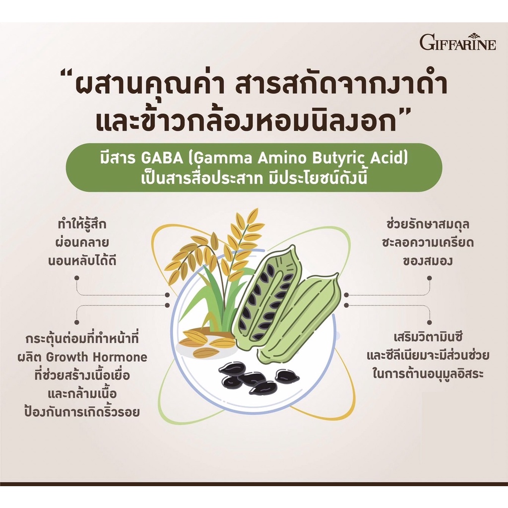 ... ่ เซซามิน(Sesamin) เซซาโมลิน(Sesamolin) และเซซามินิล กลูโคไซด์(Sesaminol glucosides) ทั้งหมดนี้ มีคุณสมบัติหลายประการ – ช่วยเพิ่มมวลกระดูก ป้องกันกระดูกพรุน – ป้องกันข้อเสื่อมและข้ออักเสบ – มีฤทธิ์ต่อต้านอนุมูลอิสระ และต้านการอักเสบ – ช่วยปกป้อง และบำรุงตับ รวมถึงการลดการสร้างโคเลสเตอรอลที่ตับ – ช่วยลดความดันโลหิต – ช่วยลดระดับโคเลสเตอรอล และลดการเกิดตะกอนในผนังเส้นเลือด – ลดความเสี่ยงโรคหัวใจ – ช่วยยับยั้งทำลายเซลล์มะเร็งเต้านม, มะเร็งตับ, มะเร็งเม็ดเลือดขาวบางชนิด เหมาะสำหรับ : บุคคลทั่วไปเพื่อบำรุงร่างกาย, บำรุงสมอง, ป้องกันมะเร็งได้หลายชนิด **** ไม่มีข้อห้ามในทุกๆ โรค **** มีงานวิจัยที่ทำในผู้ป่วยความดันโลหิตสูง โดยให้รับประทานสารสกัดเซซามินจากงาดำ 60 มก. ต่อวัน เป็นระยะเวลา 4 สัปดาห์ พบว่า สามารถลดความดันโลหิตได้เล็กน้อยประมาณ 2-3 มม.ปรอท จากระบาดวิทยาคลินิค แม้จะลดความดันโลหิตได้เล็กน้อยก็ถือว่ามีประโยชน์ต่อการช่วยลดความเสี่ยงของโรคทางสมองและหัวใจ ผลิตภัณฑ์เสริมอาหารสารสกัดจากงาดำ ผสมข้าวกล้องหอมนิลงอก วิตามินซี และซีลีเนียม ชนิดแคปซูล (ตรา กิฟฟารีน) ส่วนประกอบที่สำคัญโดยประมาณใน 1 แคปซูล o สารสกัดจากงาดำ 33.333% (200มก.) o ข้าวกล้องหอมนิลงอกบด 27.5% (165มก.) o งาดำบด 8.333 % (50มก.) o แคลเซียม แอสคอร์เบต %97 3.119 % (18.715 มก.) (ให้วิตามินซี 15 มก.) o ซีลีเนียม อะมิโนแอซิดคีเลต 1%0.292% (1.75มก.) (ให้ซีลีเนียม 17.5 มคก.) วิธีใช้ : วันละ1-2 แคปซูล หลังอาหาร รหัสสินค้า 41029 ปริมาณสุทธิ : 60.00 แคปซูล น้ำหนักรวม : 65 กรัม #งาดำ #เซซามิน #อาหารเสริม #กิฟฟารีน #giffarine #ช่วยเพิ่มมวลกระดูก #ช่วยปกป้องและบำรุงตับ #ลดความดันโลหิต #มะเร็งเต้านม #มะเร็งตับ #มะเร็งเม็ดเลือดบางชนิด #ทานได้ทั้งชายและหญิง #ไม่มีข้อห้ามทุกโรค #กระดูก #กระดูกพรุน #กระดูกแข็งแรง #ลดความดันโลหิต #มวลกระดูก #อาหารเสริมงาดำ