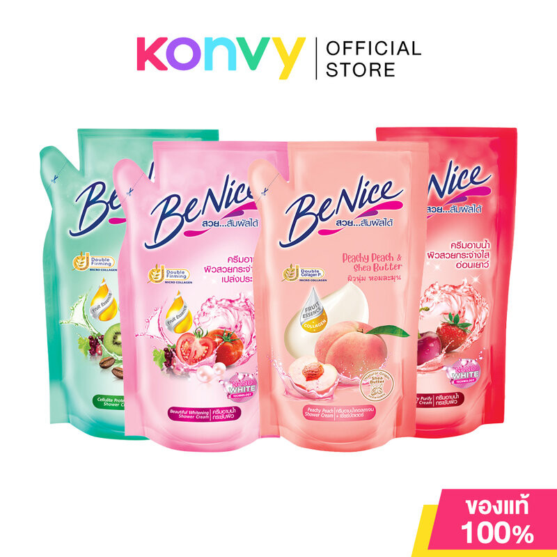 Cr: Facebook.com/BeNiceThailand BeNice Shower Cream400mlครีมอาบน้ำ ช่วยทำความสะอาดผิวอย่างอ่อนโยน • Elasticผิวกระชับ ไกลเซลลูไลท์ • Whiteningผิวสวยกระจ่างใส เปล่งประกาย • Cherry Berryผิวสวยกระจ่างใส อ่อนเยาว์ • Mystic Whiteผิวสวย หอมเนียนนุ่ม ชุ่มชื้น •Peachy Peach & Shea Butter ผิวนุ่ม