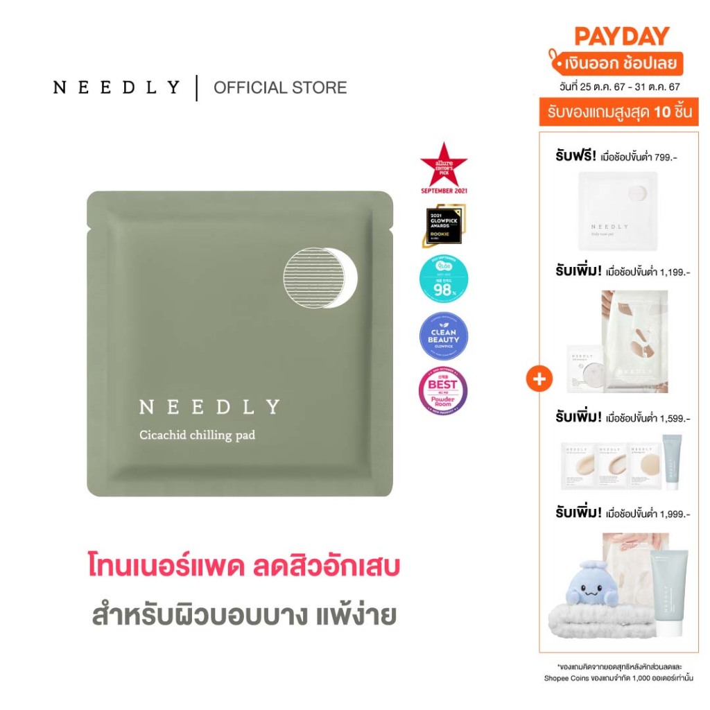 NEEDLY CICACHID CHILLING PAD 💚 ด้วยไฟตอนไซด์และสนไซเปรสที่ช่วยปลอบประโลมผิว ลดอาการระคายเคือง เติมความชุ่มชื้น สร้างสมดุลให้แก่ผิว จัดการปัญหาผิวได้ตรงจุดผ่อนคลายผิว จากความร้อนและมลภาวะให้ผิวชุ่มช่ำ เพียง 1 แผ่น ในทุก ๆ วัน 💚 ปริมาณสุทธิ 200 กรัม จำนวน 70 แผ่น 💚 วิธีใช้ : ใช้เพียงวันละ
