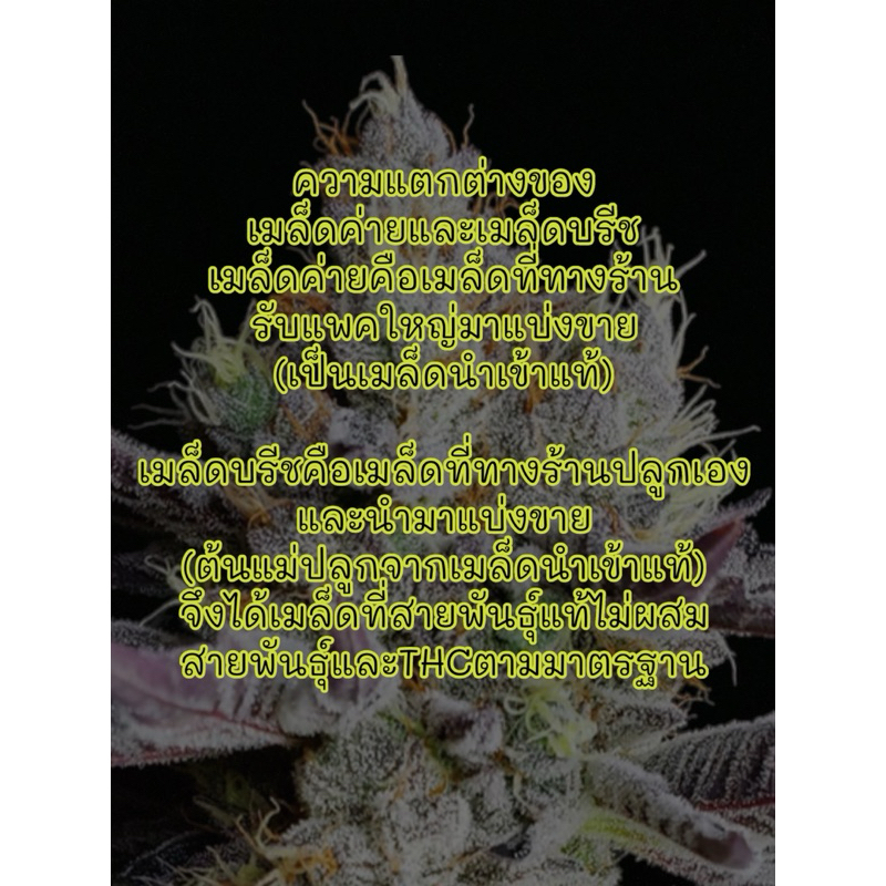 ... ม่ตก 🌳รับประกันของแท้ 100% ไม่ตรงปกยินดีคืนเงิน🌳 ✅✅เมล็ดไม่งอก เครมให้ใหม่ฟรีทั้งชุด+ปุ๋ย✅✅ ♥️สิ่งที่จะได้รับ♥️ ⏩ มีใบวิธีการปลูกให้แบบละเอียด⏪ ⏩เมล็ดบรีชจากค่ายแท้ไม่ผสมสายพันธุ์ไทย⏪ ⏩ทุกคำสั่งซื้อแถมฟรีปุ๋ยฮอร์โมนควบคุมเพศเมีย⏪ (ขนาดทดลอง) รับประกันการจัดส่ง หากเสียหายเครมให้ใหม่ทันที‼️(ถ่ายวีดีโอตอนแกะ) ♦️สินค้าแท้100% เมล็ดใหม่สดไม่ค้างเกิน1เดือน♦️ เก็บรักษาด้วยอุณหภูมิคงที่และเหมาะสม (ปกติจะขายหมดภายในไม่เกิน2อาทิตย์) ♠️อุปกรณ์สำหรับเตรียมการปลูก♠️ 1.แก้วชาไข่มุกที่มีฝากปิด เมล็ดเราสายพันธุ์นอกจึงแนะนำปลูกในระบบปิด (ฉีดน้ำให้ชุ่มชื้น ห้ามแฉะเมล็ดจะเน่าเสียได้) (ไม่แนะนำให้ปลูกในกระถางหรือวัสดุอย่างอื่น) 2.ปุ๋ยน้ำสูตรสำหรับเมล็ด(ทางร้านมีจำหน่ายสามารถใช้ได้ทั้งแช่เมล็ดและผสมน้ำรดจนต้นทำดอก เร่งโต ช่วยควบคุมเพศเมีย เพิ่มผลผลิต ดอก ใบ ลำต้นใหญ่) 3.ดินสูตรเฉพาะหรือพีชมอสจะดีที่สุด (ไม่แนะนำดินทั่วไปเพราะไม่มีสารอาหารเพียงพอและอาจแน่นเกินไปทำให้ไม่มีออกซิเจนทำให้รากเน่าหรือเมล็ดไม่งอก) ทางร้านมีจำหน่ายถึง5สูตร ตั่งแต่สูตรเพาะเมล็ดจนถึงทำดอก ♦️วิธีการเตรียมการปลูก♦️ 1.นำเมล็ดแช่น้ำเปล่า1-2วัน(แช่ปุ๋ยน้ำเร่งแช่เพียง1วันห้ามเกิน) 2.นำเมล็ดที่แช่คบแล้วนำลงไปปลูกในดินได้เลยการแช่น้ำเพื่อให้เมล็ดอิ่มตัวเพียงเท่านั้นเมล็ดจะไปงอกในดิน กดเมล็ดลงไปไม่ต้องลึกมาก‼️ห้ามบ่มในทิชชู่เด็ดขาดเพราะมันอาจจะเน่าเสีย‼️ 3.ฉีดน้ำให้ชุ่มชื้น แต่ห้ามแฉะ และปิดฝาให้สนิทนำวางไว้ในที่โดนแสงอ่อนๆ ไม่แนะนำให้วางกลางแจ้งเพราะอาจจะร้อนเกินไป 4.หลังจากนั้นคอยเช็คดูอย่างต่อเนื่องว่าดินในแก้วที่ใช้ปลูกนั้นแห้งแฉะเกินไปหรือไม่(แนะนำให้รดน้ำทุก 3 หรือ 5 วันหากให้ดีต้องเป็นน้ำที่ผสมปุ๋ยสูตรเฉพาะจะทำให้ต้นโตไวขึ้น) 5.เมื่อต้นสูงได้ประมาณ 10 cm แล้วหรือประมาณชุดใบที่ 5 ขึ้นไปให้ลูกค้าย้ายลงกระถางได้เลย หากรดน้ำเปล่าให้ลด1 ถึง 2 วันครั้ง หากลดด้วยน้ำที่ผสมปุ๋ยสูตรเฉพาะ 3-5 วันต่อครั้ง ♣️ประเภทของเมล็ด♣️ ข้อดีของออโต้♠️ Auto = Auto (เติบโตและทำดอกได้เอง) โดยไม่สนใจช่วงแสง ว่าจะมากหรือน้อย โดยปกติ ช่วงเวลาทำใบจะอยู่ที่ 30-35 วัน และทำดอกอีก 2-3เดือน Photo♥️ โฟโต้ = Photoperiod ต้นใหญ่ แข็งแรง ไวแสง เติบโตตามช่วงแสง แสงมากต้นจะทำใบ แสงน้อย( 12 ชม.ต่อวัน ) ต้นจะเริ่มทำดอก เหมาะกับการปลูก outdoor