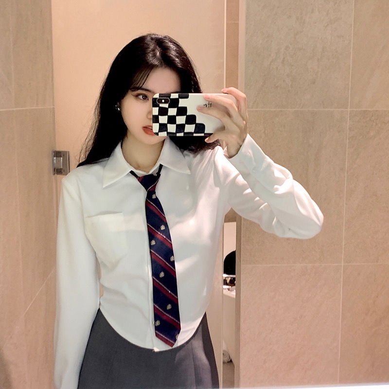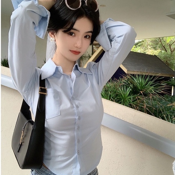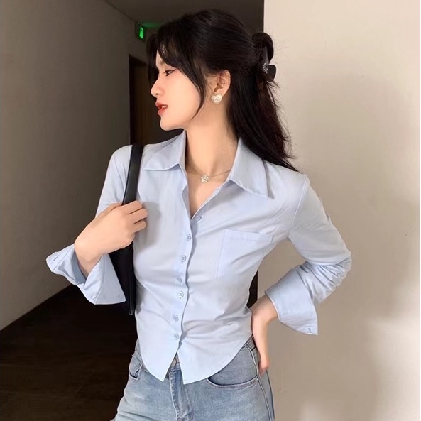 ใหม่ เสื้อเชิ้ต แขนยาว สีพื้น เอวลอย แฟชั่นฤดูใบไม้ผลิ สําหรับผู้หญิง#A90