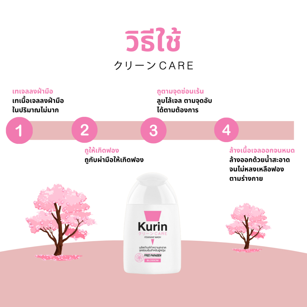 Kurin Care Feminine Wash Blossom (สีชมพู) -กลิ่นหอมของดอกซากุระ หอม หวาน ละมุน สื่อความเป็นผู้หญิงที่ชัดเจน -กลิ่นหอมสดชื่น มั่นใจตลอดวัน -เหมาะสำหรับผิวแพ้ง่าย เลขที่ใบจดแจ้ง : 10-1-6200042737 Kurin Care Feminine Wash Candy (สีส้ม) -กลิ่นหอมของลูกอมแคนดี้ สื่อความน่ารัก สดใส ขี้เล่น