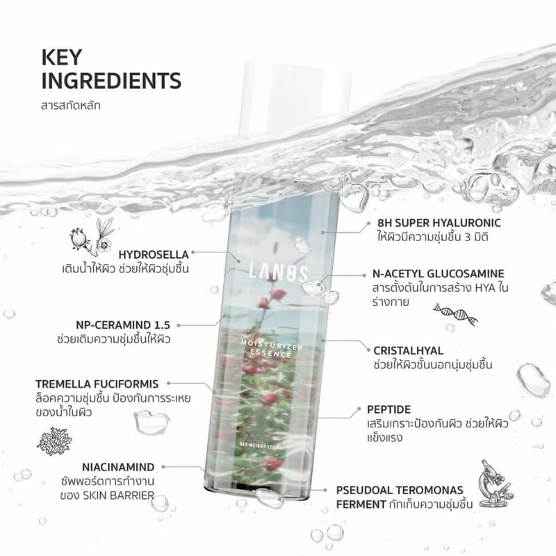... ความชุ่มชื้น ป้องกันการระเหย ของน้ำในผิว NIACINAMIND • ซัพพอร์ตการทำงาน 8H SUPER HYALURONIC • ให้ผิวมีความชุ่มชื้น 3 มิติ N-ACETYL GLUCOSAMINE • สารตั้งต้นในการสร้าง HYA ในร่างกาย CRISTALHYAL • ช่วยให้ผิวชั้นนอกนุ่มชุ่มชื้น PEPTIDE • เสริมเกราะป้องกันผิว ช่วยให้ผิวแข็งแรง PSEUDOAL TEROMONAS FERMENT • กักเก็บความชุ่มชื้น 1 ขวด ปริมาณ 120ml. ใช้ได้นาน 2-3เดือน