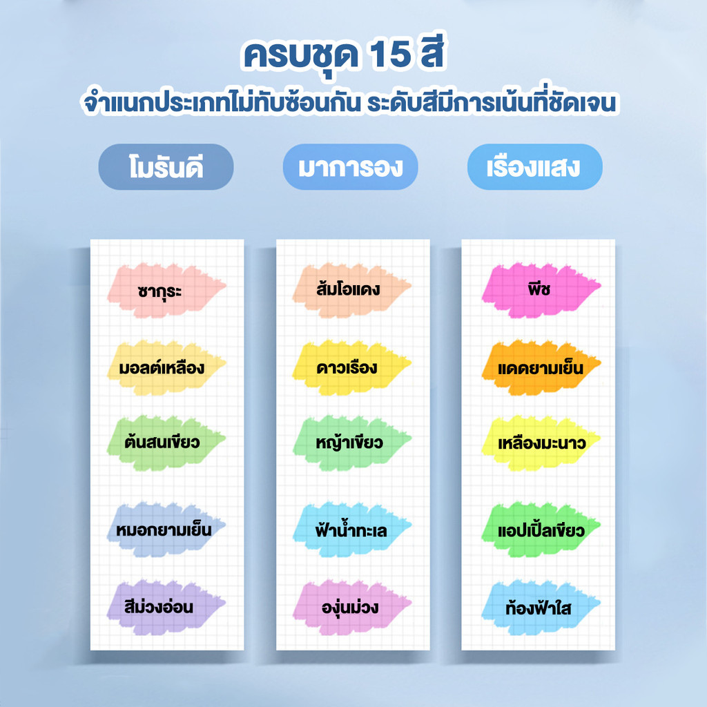 ... นวน: 5 แท่งต่อกล่อง ขอบเขตการใช้งาน: เหมาะสำหรับสำนักงาน การเรียน การจดบันทึก การวาดภาพ และโอกาสอื่นๆ ช่วยให้คุณทำเครื่องหมายและจัดระเบียบข้อมูลสำคัญได้อย่างมีประสิทธิภาพ คุณสมบัติ: ✿การใช้งานแบบสองหัว: หัวหนาและหัวบาง นอกจากฟังก์ชั่นไฮไลท์แล้ว ยังมีหัวแบบบางสำหรับเขียนและวาดเพื่อตอบสนองความต้องการในการมาร์กที่แตกต่างกัน ✿ฟรีกล่องเก็บของ: การใช้งานระยะยาว, การจัดเก็บที่มีประสิทธิภาพ, ง่ายต่อการพกพาและจัดเก็บ; ✿สีสม่ำเสมอ: ความแม่นยำของสีสูงเพื่อให้มั่นใจถึงความสม่ำเสมอของเครื่องหมายและอ่านง่าย ✿ไม่ปิดกั้นข้อมูลสำคัญ: สีอ่อนและไม่สะท้อนแสง ช่วยให้คุณอ่านเนื้อหาที่ทำเครื่องหมายได้สะดวกยิ่งขึ้น ✿ทนทาน: รีฟิลไม่แตกง่ายและมีอายุการใช้งานยาวนาน ✿เครื่องหมายจำแนกประเภท 15 สีครบชุด: ตัวเลือกที่มีสีสันเพื่อช่วยให้คุณจำแนกและจัดระเบียบข้อมูลได้อย่างมีประสิทธิภาพมากขึ้น