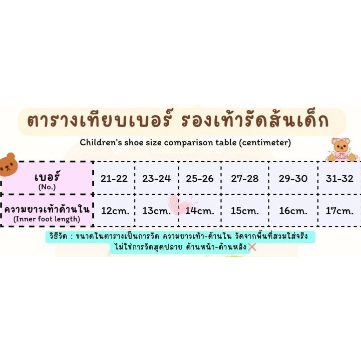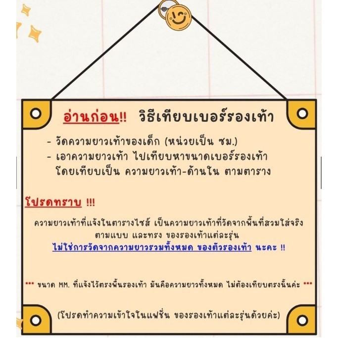 ... อกสี เลือกเบอร์ ได้ ) ขนาดความยาวรองเท้า(วัดจากด้านในรองเท้า) ร้านไม่สามารถระบุเบอร์ได้ เพราะบางลายเบอร์เดียวกันแต่ความยาวไม่เท่ากัน (ให้ดูที่ขนาดความยาวรองเท้าเป็นหลัก) ความยาววัดจากด้านในเพื่อให้พอดีเท้า Size 21-22 ขนาดความยาว 12 -13ซ.ม. คละลาย เลือกสีได้ Size 23-24 ขนาดความยาว 13.5 -14ซ.ม. คละลาย เลือกสีได้ Size 25-26 ขนาดความยาว 14.5-15 ซ.ม. คละลาย เลือกสีได้ โปรดอ่านรายละเอียด และวัดขนาดไซส์ให้เรียบร้อย ทางร้านไม่รับเปลี่ยนสินค้า เพราะจะมีปัญหากับสต็อค ทางร้านไม่รับเปลี่ยนสินค้า สต็อกสินค้าจะคลาดเคลื่อน การขอเปลี่ยนสินค้า จะไม่คุ้ม กับค่า ส่งสินค้า เพราะลูกค้า จะต้องออกค่าส่งเอง ทั้งไปและกลับ(ไม่คุ้ม) ขอขอบคุณที่ลูกค้าเข้าใจในรายละเอียดทั้งหมดนี้ (การจัดส่งสินค้า) ร้าน.จัดส่งสินค้า/ทุกวัน ตัดรอบส่ง09.000-21.00น.(รถมารับสินค้าวันละรอบครับ) หลัง21.00น.ส่งวันถัดไปนะครับ สินค้ามีปัญหา ให้ลูกค้าทักแชท สอบถามมาที่ทางร้าน ก่อนนะครับ อาจเกิดการผิดพลาด ทางร้านยินดีครับ ขอบพระคุณลูกค้าทุกท่านที่ไว้วางใจทางร้าน (สินค้ามีปัญหา สอบถาม ทางร้านได้ ด้วยความยินดี)