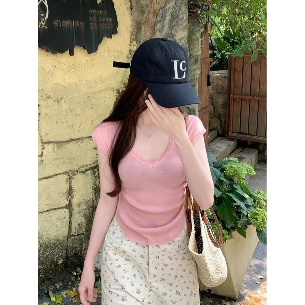 Miss Kitty 🔥พร้อมส่ง🔥เสื้อครอป เสื้อยืดผู้หญิง ครอปแขนสั้น คอวี แขนสั้นแฟชั่น น่ารัก สีพื้น สไตล์เกาหลี *X52*