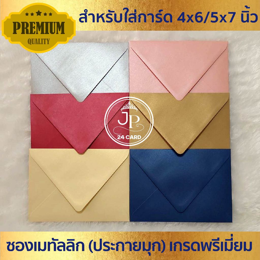 ... .................................... รายละเอียด :ซองเนื้อเมทาลิก สำหรับใส่การ์ด 5x7 นิ้ว ขนาด : 5.25 x 7.25 นิ้ว (สำหรับใส่การ์ด 5x7 นิ้ว) กระดาษเนื้อเมทาลิก ประกายมุก ความหนา : 100 แกรม บรรจุ : 1 แพ็ค มี 50 ซอง สีซองด้านนอกตามรูปภาพของซอง ด้านในซองสีขาว .......................................... รายละเอียด :ซองเนื้อเมทาลิก สำหรับใส่การ์ด 4x6 นิ้ว ขนาด : 4.25 x 6.25 นิ้ว (สำหรับใส่การ์ด 4x6 นิ้ว) กระดาษเนื้อเมทาลิก ประกายมุก ความหนา : 100 แกรม บรรจุ : 1 แพ็ค มี 50 ซอง สีซองด้านนอกตามรูปภาพของซอง ด้านในซองสีขาว ............................................. รายละเอียด :ซองปอนด์ สำหรับใส่การ์ด 5x7 นิ้ว ขนาด : 5.25 x 7.25 นิ้ว (สำหรับใส่การ์ด 5x7 นิ้ว) กระดาษปอนด์ ความหนา : 100 แกรม บรรจุ: 1 แพ็ค มี 50 ซอง สีซองด้านนอกและด้านในเป็นสีเดียวกัน ....................................... รายละเอียด : ซองปอนด์ สำหรับใส่การ์ด 4x6 นิ้ว ขนาด : 4.25 x 6.25 นิ้ว (สำหรับใส่การ์ด 4x6 นิ้ว) กระดาษปอนด์ ความหนา : 100 แกรม บรรจุ: 1 แพ็ค มี 50 ซอง สีซองด้านนอกและด้านในเป็นสีเดียวกัน ......................................... * มีชุดตัวอย่างซองจำหน่าย * (ชุดตัวอย่างซองเมทาลิก สำหรับใส่การ์ด 5x7 นิ้ว มี 6 สี (สีละ 1 ซอง) (ชุดตัวอย่างซองปอนด์ สำหรับใส่การ์ด 5x7 นิ้ว มี 18 สี (สีละ 1 ซอง) (ชุดตัวอย่างซองปอนด์ สำหรับใส่การ์ด 4x6 นิ้ว มี 13 สี (สีละ 1 ซอง) ......................................... ***คลิปวีดีโอหน้าคำสั่งซื้อ เป็นคลิปวีดีโอที่ทางร้านถ่ายเองทั้งหมด*** (ห้ามคัดลอก ดัดแปลง หรือก็อปปี้ วีดีโอหน้าคำสั่งซื้อของร้านไปใช้ หากพบเห็นจะดำเนินคดีตามกฎหมายถึงที่สุด) **สีที่ลูกค้าเห็นในจอ กับสีจริงที่มองจากดวงตา อาจต่างกันเล็กน้อย** ขึ้นอยู่กับการแสดงผลของหน้าจอ (มือถือ แทปเล็ต จอคอม) ที่แตกต่างกันค่ะ ......................................... ✔️ลูกค้าช่วยตรวจสอบ ชื่อ ที่อยู่ และเบอร์โทร สำหรับจัดส่งพัสดุ ที่แจ้งไว้ในระบบช็อปปี้ ให้ถูกต้องด้วยนะคะ✔️ 💢ได้รับสินค้าแล้วโปรดกดยืนยันการรับสินค้าให้ทางร้านด้วยนะคะ ขอบพระคุณลูกค้าค่ะ🙏🏻