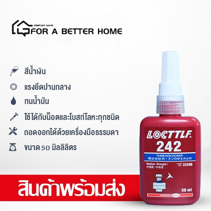 (เบอร์ 242/243) เบอร์ 242 สีน้ำเงิน ทนน้ำมัน ทนความร้อน เบอร์ 243 สีน้ำเงิน ใช้ทั่วไป ทนน้ำมัน ทนสารเคมี - แรงยึดปานกลาง - สี: น้ำเงิน - เหมาะสำหรับงานที่ต้องการถอดออกได้ด้วยเครื่องมือธรรมดา วิธีใช้ 1. ใช้ได้กับเกลียวโลหะขนาด 1/4" ถึง 3/4" 2. แรงยึดสูง 100/200 ปอนด์.นิ้ว 3. เวลาการยึดติด