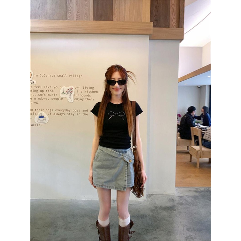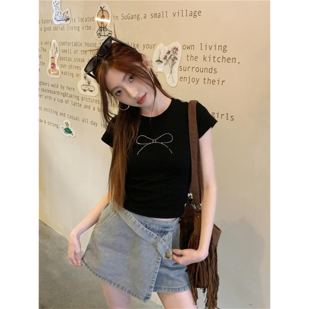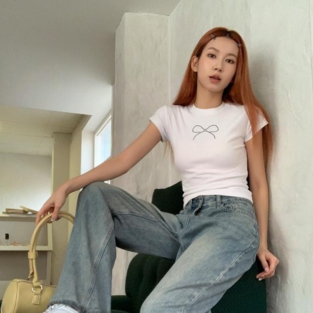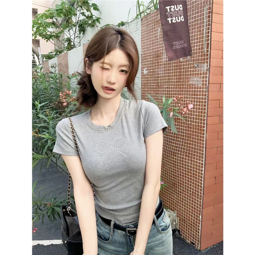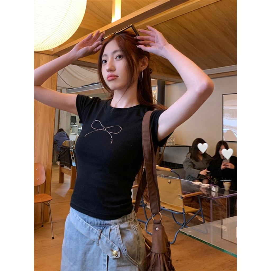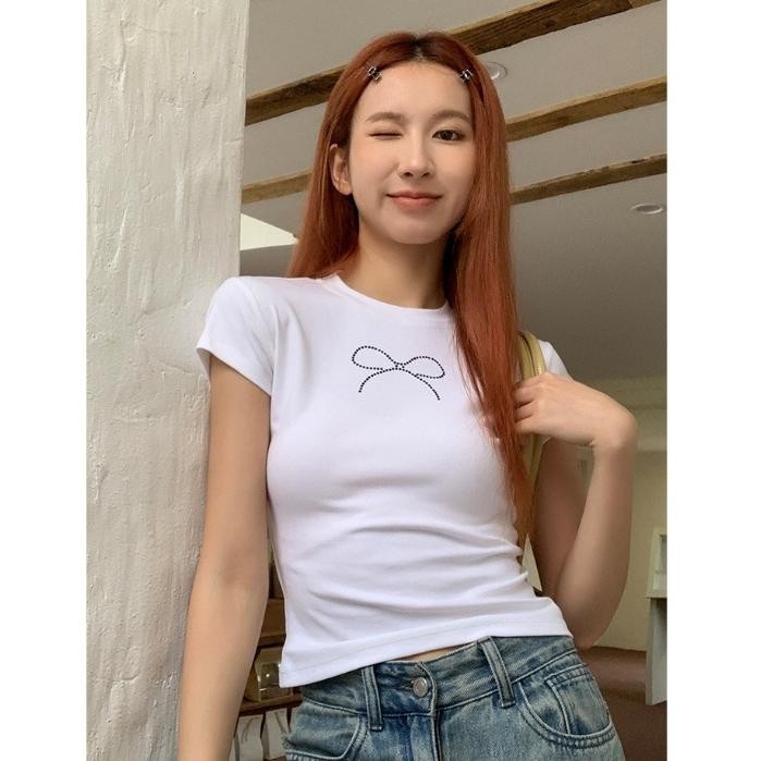 cherryshop พร้อมส่ง Y2K CROP TOP ครอปรัดรูป เสื้อยืดแขนสั้นคอกลมผู้หญิงสีขาว เสื้อครอปสั้นดัดโบว์เซ็กซี่ ทรงเข้ารูป