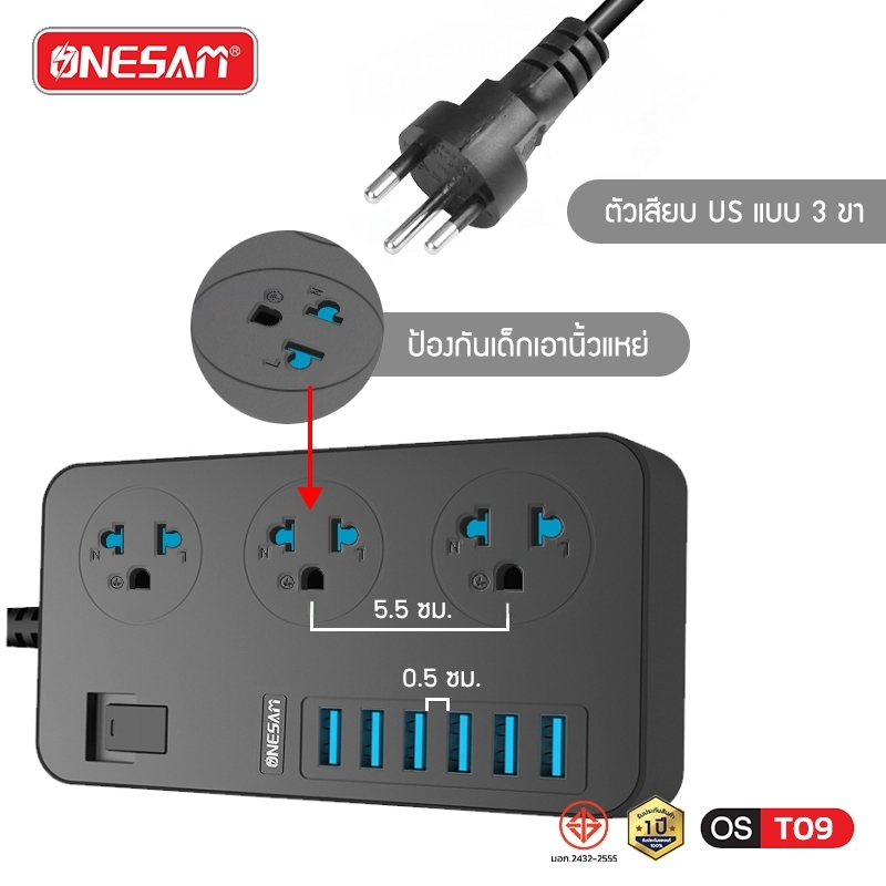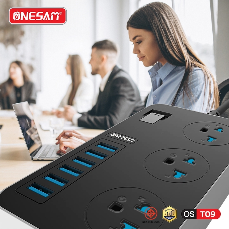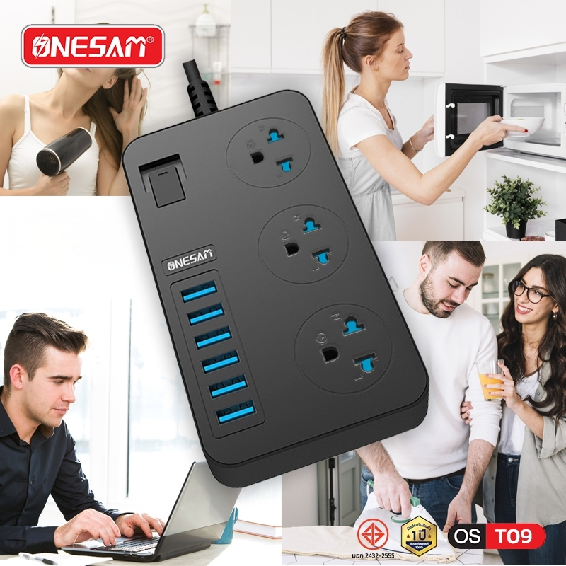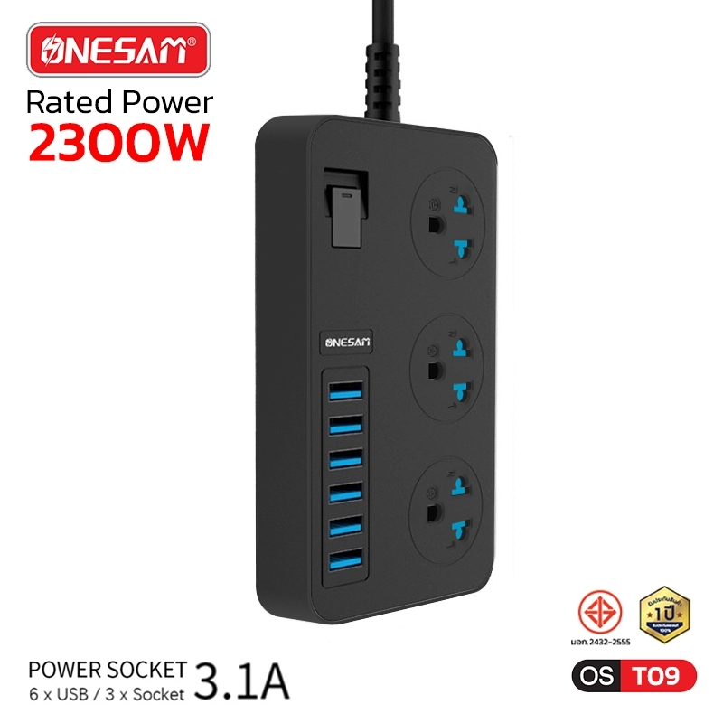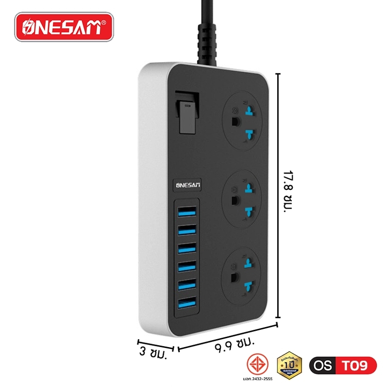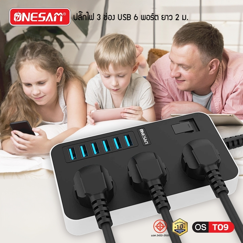 ปลั๊กไฟ ONESAM รุ่น OS-T09 (PLUGTHAI) ปลั๊ก 3 ช่อง USB 6 พอร์ต ยาว 3 เมตร