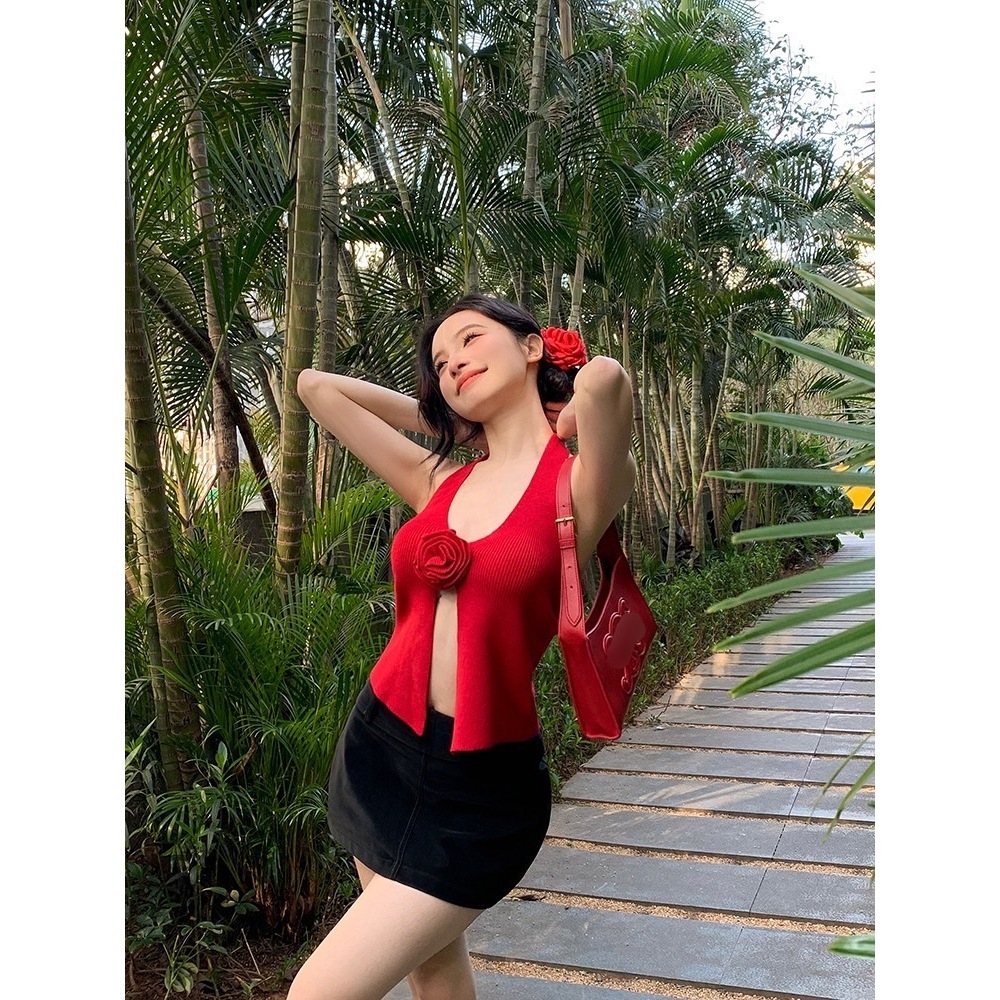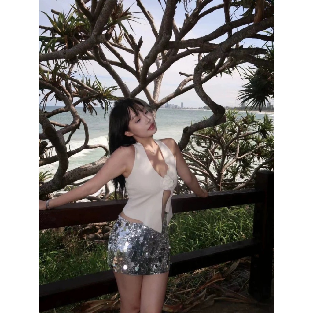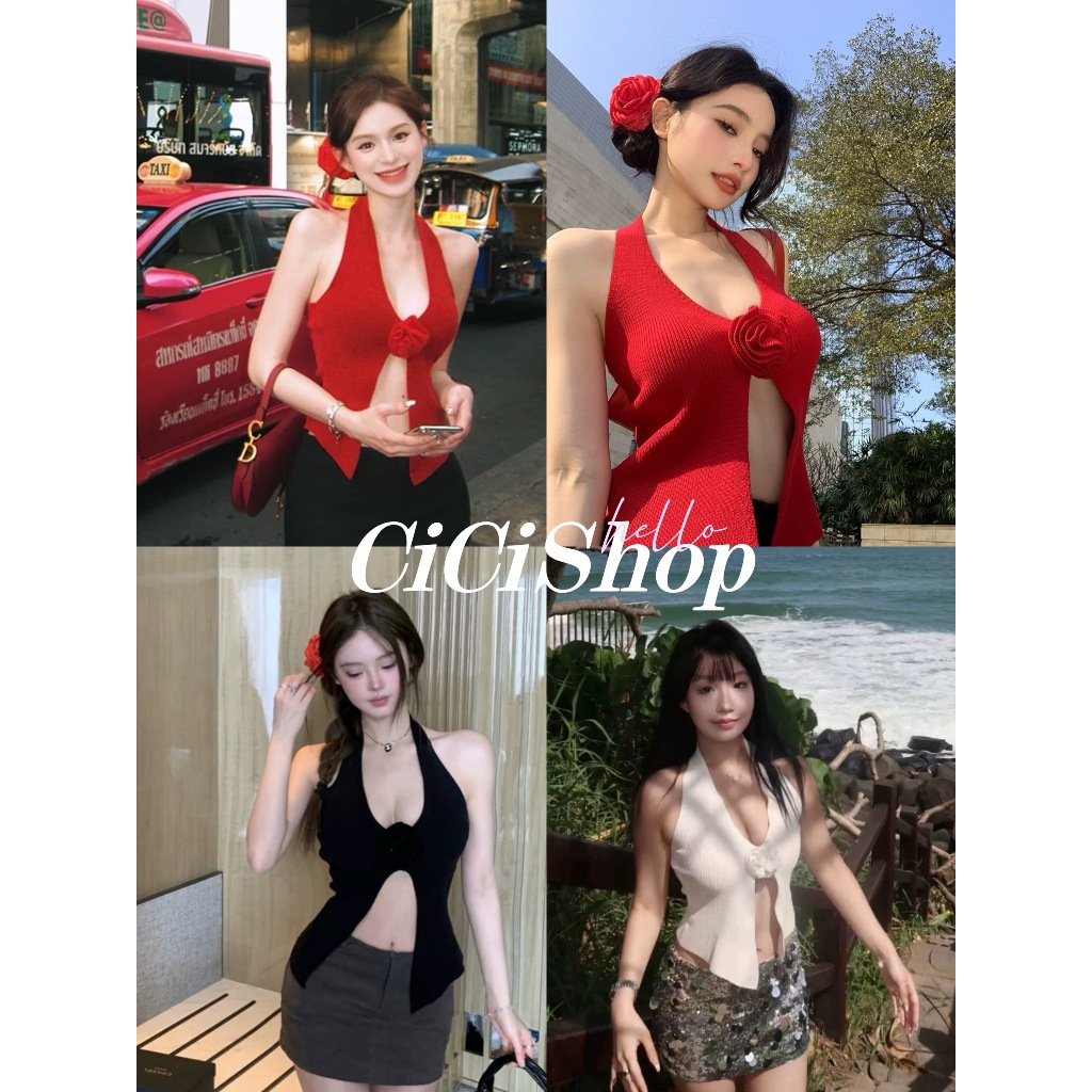 Cicishop(24046-1)เสื้อคล้องคอไหมพรม ดีเทลเว้าหน้า แซ่บเบอร์10 สไตล์สาวฮาวายสุดๆ