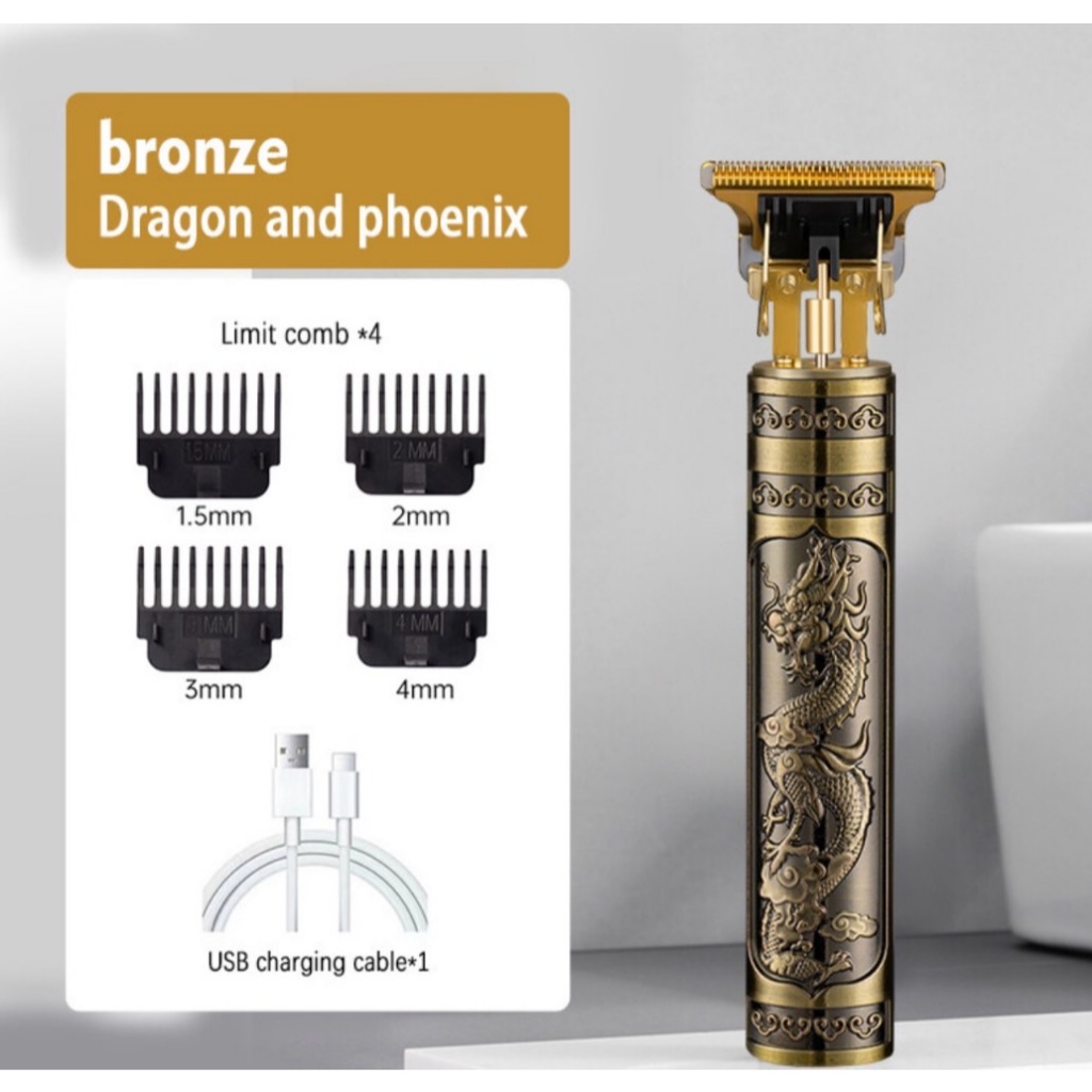 ตัวเครื่องบรอนซ์บรอนซ์เป็นสีบรอนซ์พร้อมลวดลายการแกะสลักที่สวยงามทั้งตัวเครื่องย้อนยุคและมีสไตล์ 2. ตัวยึดระบบกันสะเทือน 3. มองเห็นได้ซึ่งไม่มีผลต่อการมองเห็นขณะจับผม 4. ไฟแสดงสถานะการชาร์จ ไฟสีแดงเมื่อชาร์จแล้วไฟจะเปลี่ยนเป็นสีเขียวเมื่อชาร์จเต็ม 5. ปัตตาเลี่ยนตัดผมไร้สายที่ใช้พลังงานจ