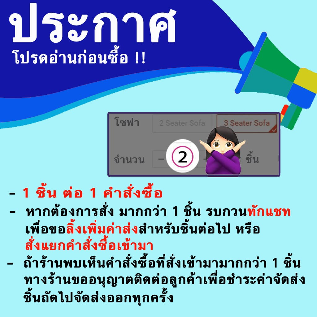 ... กลูกค้าสั่งเข้ามาในออเดอร์เดียวกัน ทางร้าน จำเป็นต้องขออนุญาตเก็บค่าชำระเพิ่มในส่วนของสินค้าตัวที่ลูกค้าเพิ่มเข้ามานะครับ เนื่องจากขนส่งเก็บค่าส่งทุกชิ้นครับ ต่อให้เป็นที่ เดียวกัน❗❗ 👏ขอบคุณที่อ่านและเข้าใจครับ🙇‍♂️ 🛫 ของใหม่ จัดส่งสินค้าทั่วประเทศ 🛬 🌵พื้นที่เกาะ จ.แม่ฮ่องสอน และ 3 ชายแดนภาคใต้มีค่าจัดส่งตามระยะทางเพิ่มเติม🌵 🚛 ปกติส่งของทุกวัน จันทร์-เสาร์ (ไม่นับวันหยุด) ^^ ⏱ 💌 อย่าลืมตรวจสอบที่อยู่จัดส่งและเบอร์โทรให้ถูกต้อง ก่อนกดยืนยันการสั่งซื้อนะครับ 😊 🔥 ※เพราะทางร้านไม่สามารถเปลี่ยนข้อมูลให้ได้※ 🔥 📑 รายละเอียดสินค้า OLLY Canvas Sofa Bed โซฟา โซฟาปรับนอน โซฟาปรับนอน ทูอินวัน ปรับนอนได้ 🛕แบรนด์🛕 : Carlino วัสดุการผลิต : วัสดุ: ไม้, ฟองน้ำ, ผ้าแคนวาส ขาตั้ง PVC ขนาดโซฟา 2 ที่นั่ง : ยาว 115 ซม. กว้าง 45 ซม. สูง 70 ซม. ขนาดโซฟา 3 ที่นั่ง : ยาว 140 ซม. กว้าง 45 ซม. สูง 70 ซม. ขนาดโซฟา 4 ที่นั่ง : ยาว 170 ซม. กว้าง 45 ซม. สูง 70 ซม. **โปรดทราบว่าอาจมีความแตกต่างกันเล็กน้อยเมื่อเทียบกับผลิตภัณฑ์จริงเนื่องจากการวัดขนาดด้วยตนเอง 🌿🌿 คุณสมบัติสินค้า 🌿🌿 🌠 ปรับนั่ง และนอนได้ 🌠 ใช้พื้นที่ค่อนข้างน้อย ช่วยในการประหยัดพื้นที่ใช้สอย 🌠 ห่อหุ้มด้วยผ้าแคนวาส ระบายความร้อนได้ดี คงทนต่อแสงแดด UV แข็งแรงทนทาน ไม่ขาดง่าย 🌠 ภายใน - บุด้วยฟองน้ำที่มีความหนาแน่นถึง 7 ซม. ที่มีความยืดหยุ่นไม่เปลี่ยนรูปง่าย 🌠 โครงโซฟา - ทำจากไม้ 2 ประเภท คือ ไฟเบอร์บอร์ดที่มีความหนาแน่นปานกลาง และไม้เนื้อแข็ง ที่จะช่วยให้โซฟามี ความแข็งแรงทนทานยิ่งขึ้น 🌠 ขาผลิตจาก PVC คุณภาพดีสีดำ 🌠 ทำความสะอาดง่าย เพียงแค่ปัดกวาดเช็ดถู และนำไปผึ่งแดดบ้างเล็กน้อย ก็จะช่วยทำให้โซฟามีอายุการใช้งานที่ยาวนานขึ้น วิธีการใช้ 🎯 -ใช้สำหรับนั่ง นอนพักผ่อน 🚨หมายเหตุ - สินค้าต้องประกอบขาโดยใช้เพียงแค่มือหมุน🚨 ➖➖➖➖➖➖➖➖➖➖➖➖➖➖➖➖➖➖➖➖➖➖➖➖➖➖➖➖➖➖➖➖➖➖➖➖➖➖➖➖ 🧰 ในกล่องประกอบด้วย โซฟาพับนอนขนาด 1 ตัว ขาโซฟา 4 ขา สำหรับโซฟา 2 ที่นั่ง ขาโซฟา 5 ขาสำหรับโซฟา 3 ที่นั่ง และ 4 ที่นั่ง ❗❗ หมอนเป็นเพียงภาพประกอบโฆษณาเท่านั้น ❗❗ สีที่มีให้เลือก 🟤Brown 🔘 Grey 🔴 Red ⚫ Black 🛬 สำหรับขนส่งมีบริการเก็บเงินปลายทาง (Cash On Delivery) Shopee จะเลือกบริษัทขนส่งให้ลูกค้าโดยอัตโนมัติ 🛬 🚆 Seller Own Fleet จัดส่งผ่านบริษัทขนส่งเอกชนขนาดใหญ่ : กรุงเทพฯ-ปริมณฑล 4-7 วันทำการ, ต่างจังหวัด 5-10 วันทำการ ❌❌ พื่นที่ที่ไม่มีบริการจัดส่ง แม่ฮ่องสอน, นราธิวาส,ยะลา,ปัตตานี และเกาะทุกพื้นที่ ❌❌ 📝 เงื่อนไขการเคลมสินค้า📝 🚨 หากชิ้นส่วนอุปกรณ์ที่ได้รับไม่ครบ หรือชิ้นส่วนเสียหายระหว่างทางการจัดส่งสินค้า🚨 ขอ