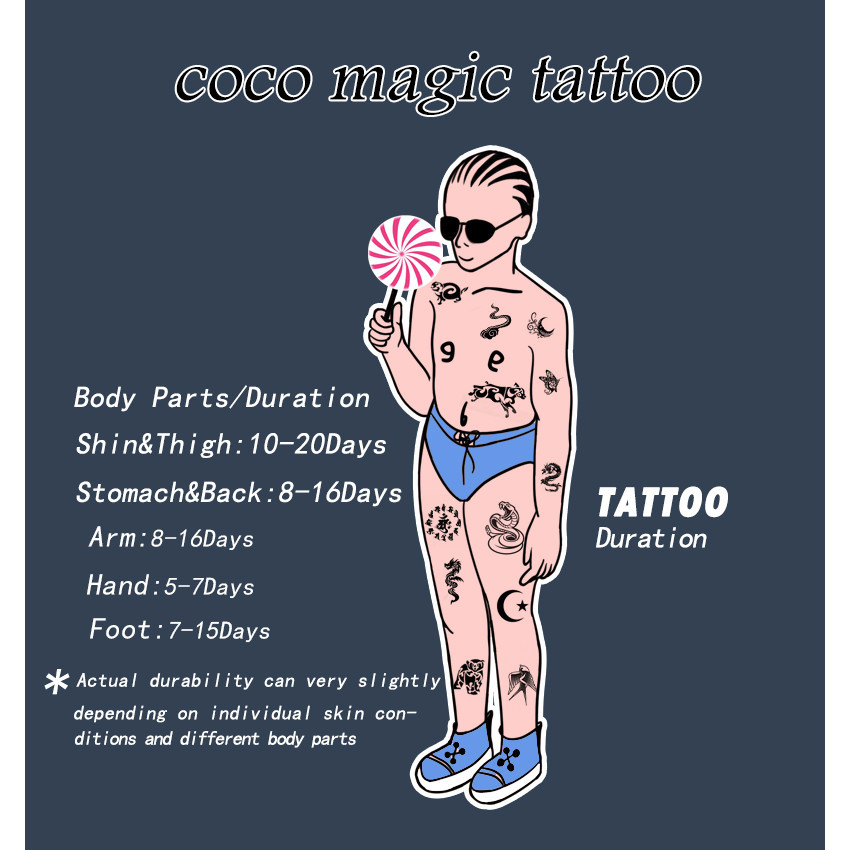 ยินดีต้อนรับสู่ COCO Magic Tattoo Shop ✨มาลองใช้ผลิตภัณฑ์เทคโนโลยีล่าสุดของเรากันเถอะ✨ ✨✨สติกเกอร์รอยสักกึ่งถาวร✨✨ รายละเอียดสินค้า】【คุณสมบัติของสินค้า】 💎 สูตรพืชพืชสูตรอ่อนโยนและปลอดภัย 💎 ผลิตภัณฑ์ผ่านการรับรอง FDA / ISO 9001 / GMPC 💎สามารถเปลี่ยนลายสักได้ตามต้องการโดยไม่ทำร้ายผิว