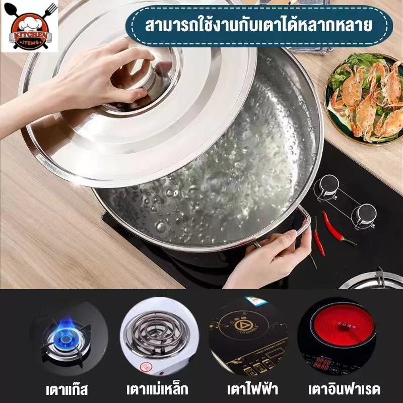 ... ่ ง่ายต่อการใช้งานและถูกสุขอนามัยมากขึ้น ◎ ด้ามจับหนา --- ขอบจับเรียบและทนทาน ◎ ด้านล่างหนาและทนต่อความร้อน --- ด้านล่างแบนหนา รับความร้อนสม่ำเสมอและแน่นโดยไม่มีการรั่วซึม ◎ใช้ได้กับสถานที่ต่างๆ --- งานเลี้ยง ตลาด โรงแรม ครัวเรือน ร้านอาหาร โรงอาหาร คำแนะนำเพิ่มเติม: 25ซม=10ลิตร. 30ซม= 20ลิตร 35ซม=34ลิตร 40ซม=50ลิตร 45ซม=72ลิตร 50ซม=98ลิตร 60ซม=164ลิตร