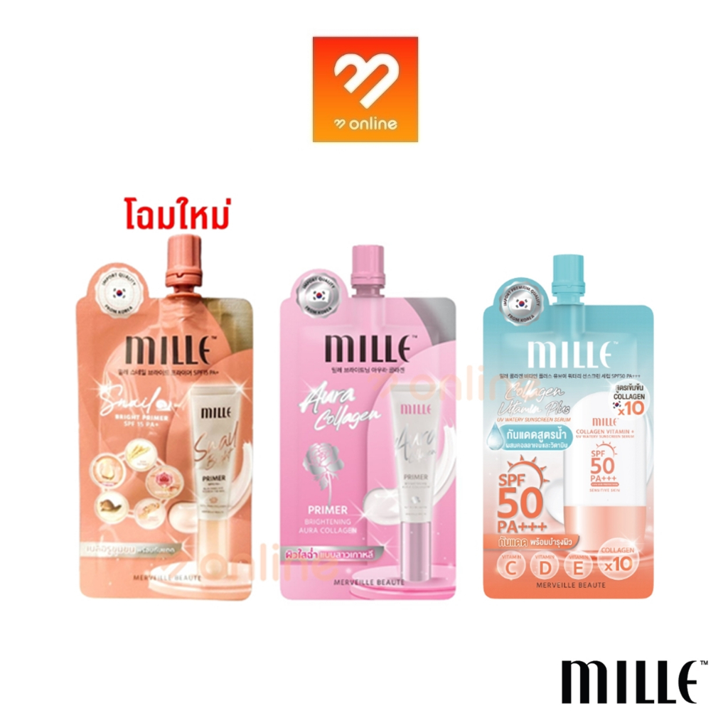 (ยกกล่อง) Mille Snail Bright Primer / Brightening Aura / UV watery มิลเล่ สเนล ไบร์ท ไพรเมอร์ ครีมซอง กันแดดเซรั่ม 6 g