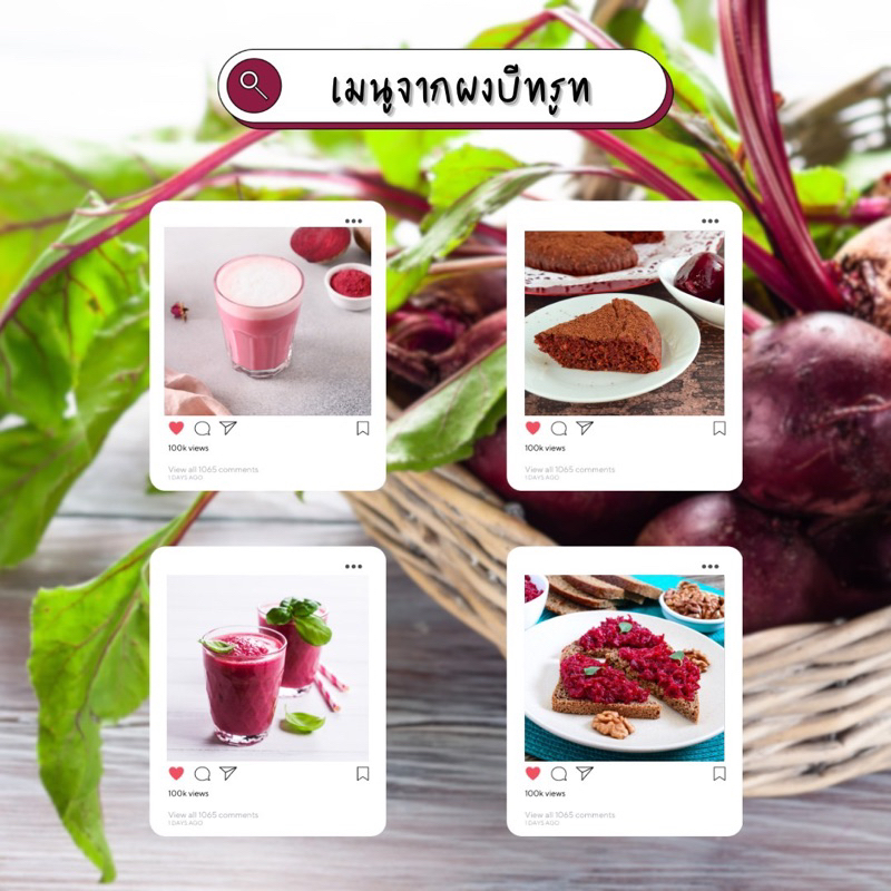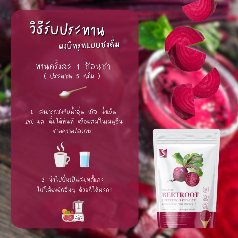 ... ถภาพในการวิ่งเพิ่มขึ้น รับประทานต่อเนื่องทุกวัน ทำให้เล่นกีฬาได้ทนทานขึ้น บรรจุในซองฟอยด์ แบบไม่มีหน้าต่าง ทางแบรนด์พัฒนาและผลิตขึ้นพิเศษเพื่อกันความชื้นเข้าและคงคุณค่าสารอาหารไว้ได้นานกว่าซองฟอยด์ทั่วไป จึงเก็บรักษาไว้ได้นานและดีกว่า ผงบีทรูท ของเราผลิตด้วยนวัตกรรมฟรีซดราย (Freeze Dried) ซึ่งเป็นนวัตกรรมที่นักบินอวกาศเลือกใช้และเป็นเกรดเดียวกับอาหารเสริมที่ใส่ในแคปซูล เพราะสามารถยืดอายุการเก็บรักษาได้นานถึง 25-50 ปี ช่วยคงคุณค่าสารอาหารได้มากกว่า 97% ผลิตโดยกระบวนการ Freeze Dried แบบเข้มข้น (20 ต่อ 1) โดยใช้ผักสดและผลไม้ถึง 20 kg ในการสกัดผงผักรวม 1 kg กระบวนการผลิตที่แบบไม่ผ่านความร้อนร้อน เพื่อคงคุณค่าสารอาหารในผักให้ได้มากที่สุด การผลิตด้วยนวัตกรรม Freeze Dried (การทำแห้งแบบแช่เยือกแข็ง) เป็นการใช้ความเย็นในการทำแห้ง ซึ่งต่างจากการทำแห้งด้วยวิธี Spray Dry ที่ใช้ความร้อนในการทำแห้ง นอกจากจะทำให้วิตามิน ใยอาหารและสารต้านอนุมูลอิสระ สลายไปเกินครึ่งนึงแล้ว ประโยชน์ที่ได้รับเมื่อเทียบกับความคุ้มค่าที่เสียไปยังแตกต่างกันอีกด้วย